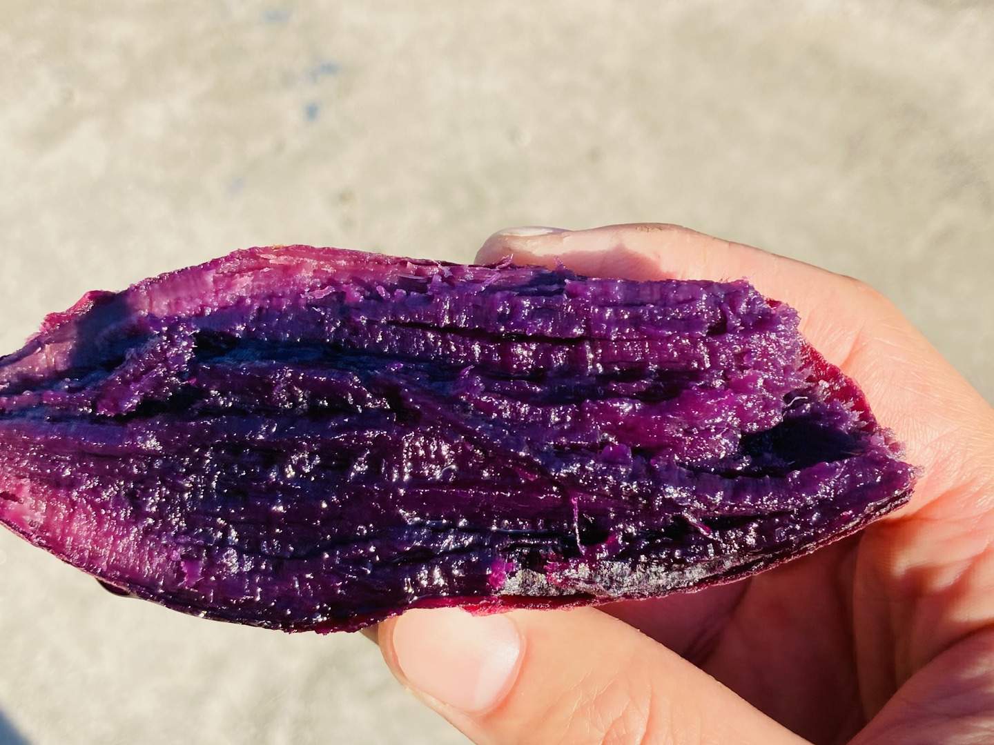 『ふくむらさき』は、肉質が粘質でしっとりとした食感の紫いもです。蒸したり焼いたりした際の糖度は非常に高く、「べにはるか」や「パープルスイートロード」と同等以上です。肉質の色は「パープルスイートロード」よりも濃い紫色で、見た目も鮮やかです。