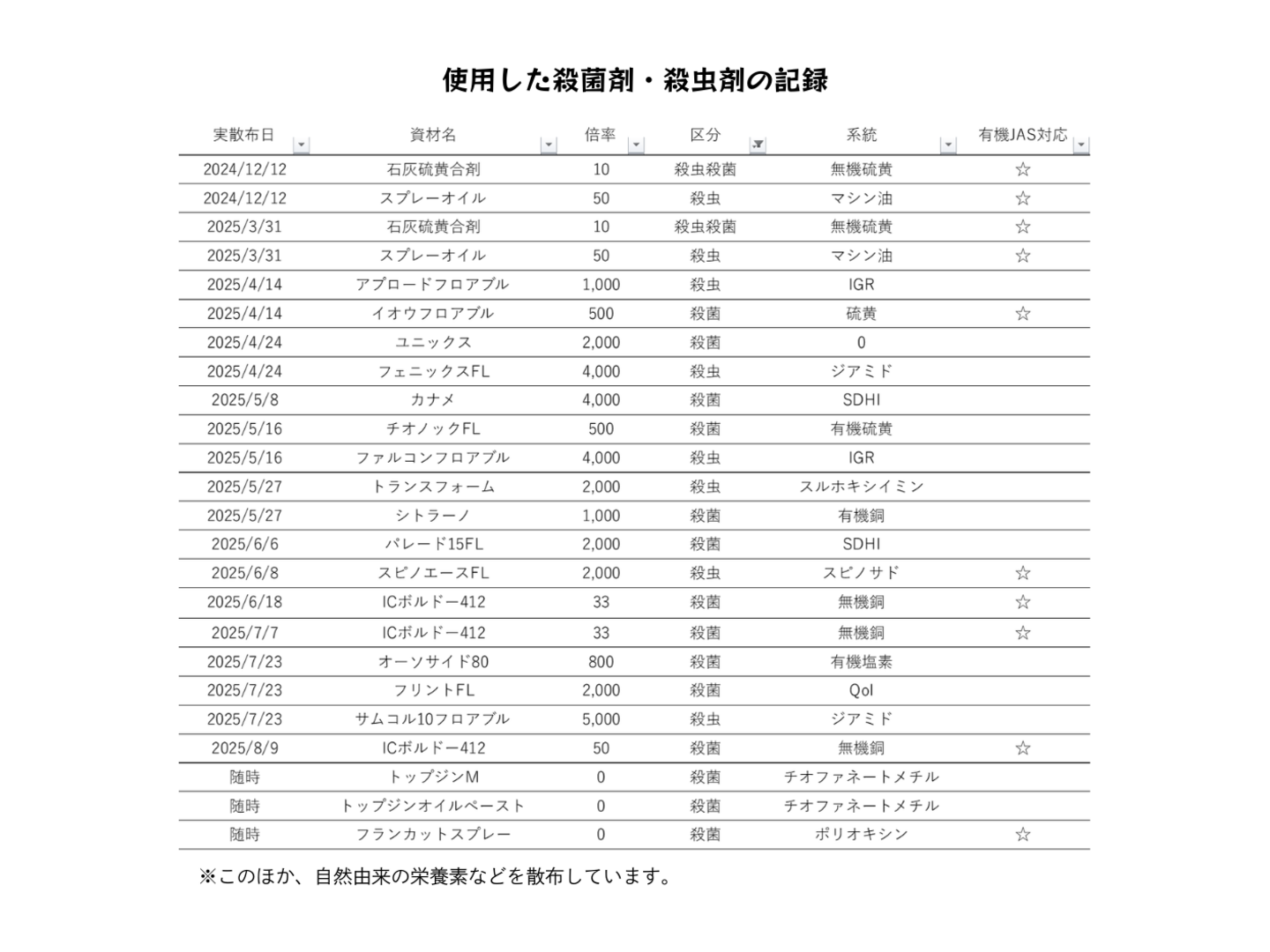 éšææã«éäžããããã®åŸã¯ææ©JASèªèšŒã®èŸ²è¬ãæš¹äœãèãäžå€«ã«ãã倩ç¶ç±æ¥ã®é€åãäžå¿ã«æ£åžããŠããŸããã