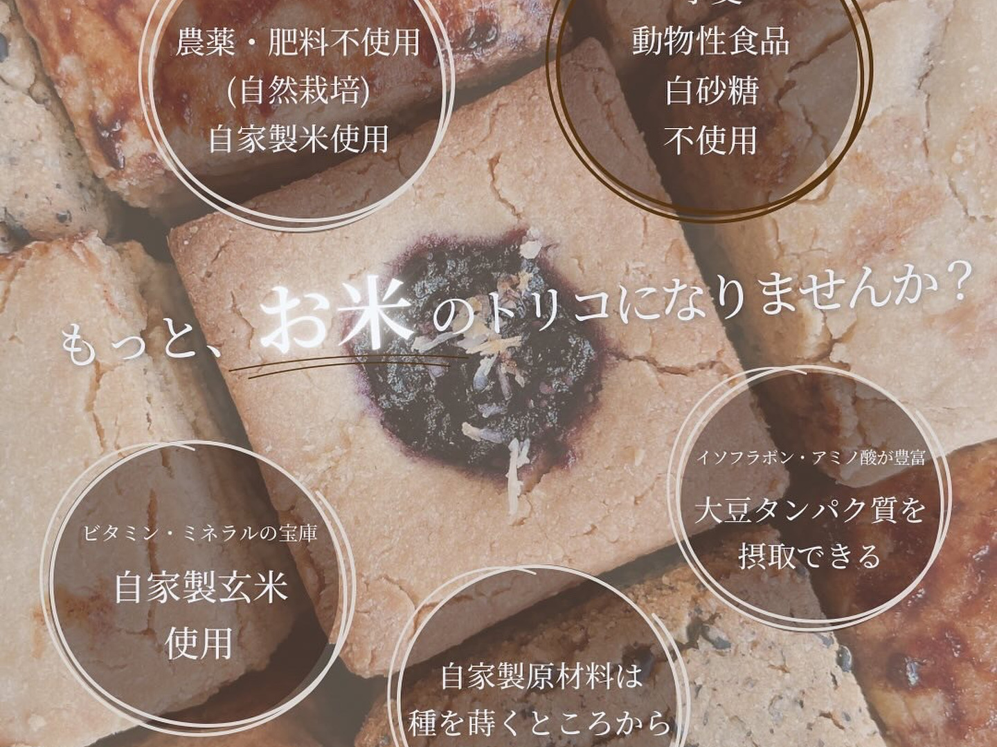 原材料:玄米(自家製),素焚糖(国産),圧搾菜種油(国産),大豆(自家製),豆乳(自家製),片栗粉(※,国産),有機ごま,塩麹(自家製),天然塩/重曹