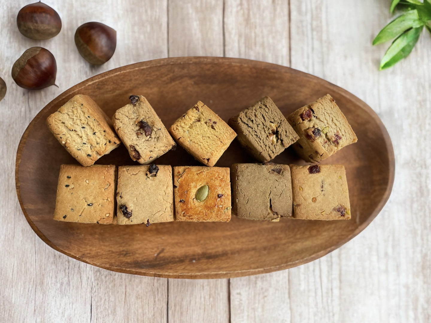 原材料:玄米(自家製),素焚糖(国産),圧搾菜種油(国産),大豆(自家製),豆乳(自家製),片栗粉(※,国産),栗(自家製),クルミ,有機ほうじ茶(国産),黒糖(国産),天然塩/重曹