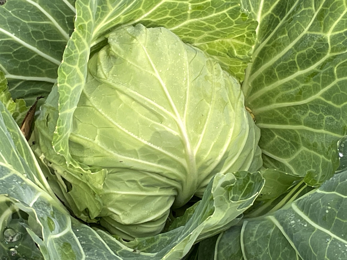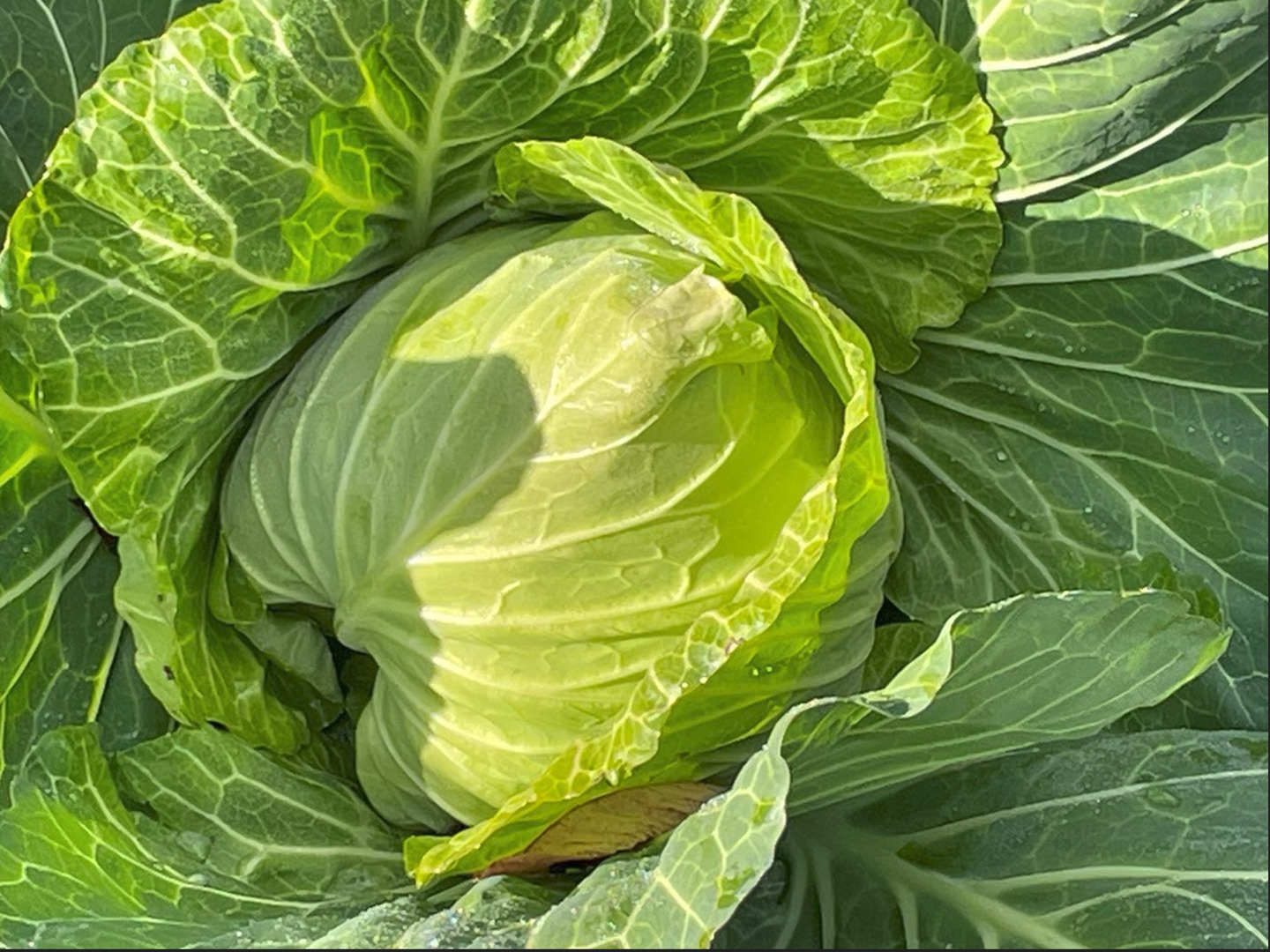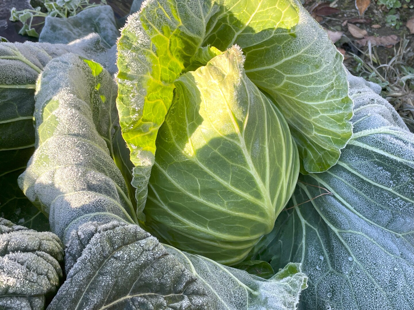 12月に入ると、当園には毎日のように霜が降ります。この冷気から身を守るために、キャベツはアントシアニン(ポリフェノールの一種)を作り出して少し紫色に色づき始め、より甘さが増します!その一方で、内葉に黒い斑点が現れる場合があります。これは葉の内側にできた水滴が氷り、昼間の気温上昇により溶けて黒点になったもので、ポリフェノールの色だったり、細胞組織が壊れたものです。見た目は悪くても美味しく食べられますのでご安心下さい!