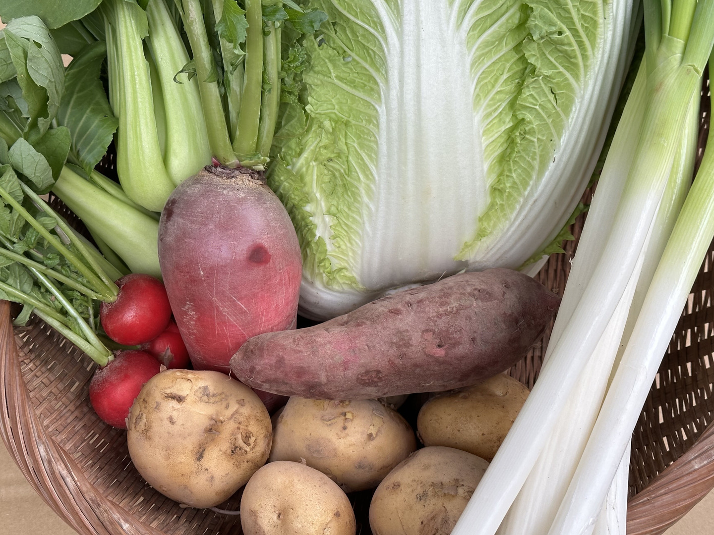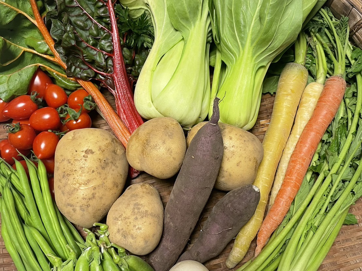 化学肥料不使用・栽培期間中農薬不使用(さつま芋類を除く)の旬の採れたて野菜を箱いっぱい詰め込んでお送りいたします。