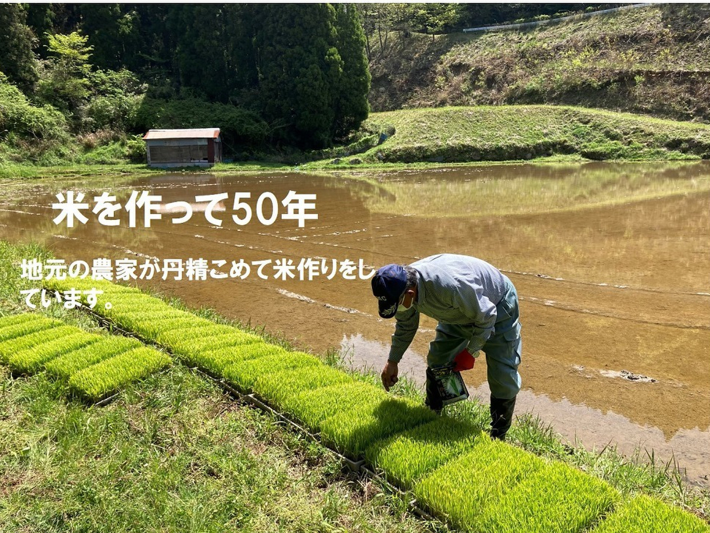 山間部は平地に比べても寒暖差が激しいこともあり、お米の病気等がすくなく、農薬の使用量も通常の慣行栽培に比べても少なく栽培しております。