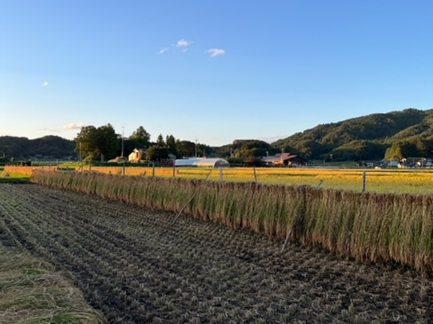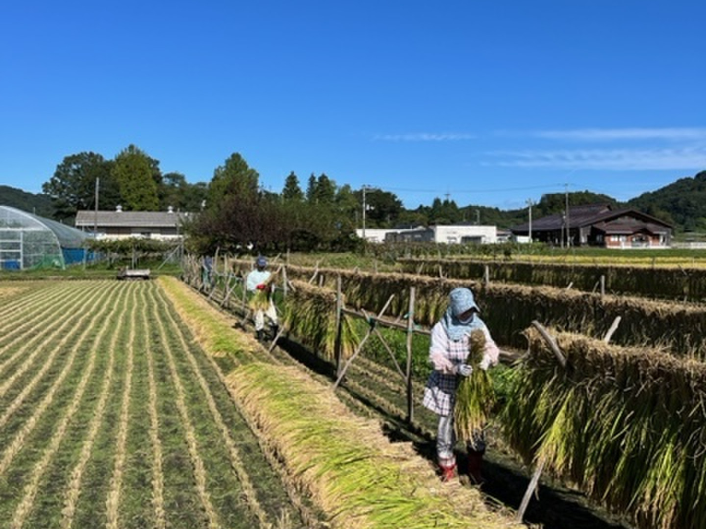 稲刈り後は、昔ながらのはせ掛けをして時間をかけて乾燥させます。「はせ掛け」は木や竹で作ったハセに稲束をかけて太陽と風の力を借りて乾燥させる事で今ではすっかり減ってしまいました。