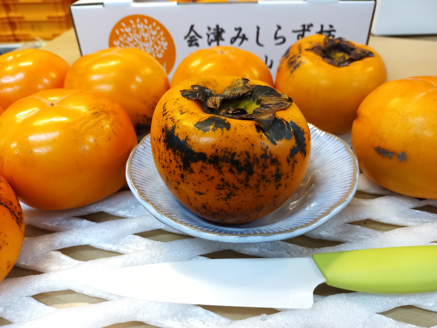 ※柿表面の黒い斑点や線、芯やヘタの辺りの黒い部分は柿の成分(タンニン)です。脱渋することで濃く現れますが品質には問題ありません。