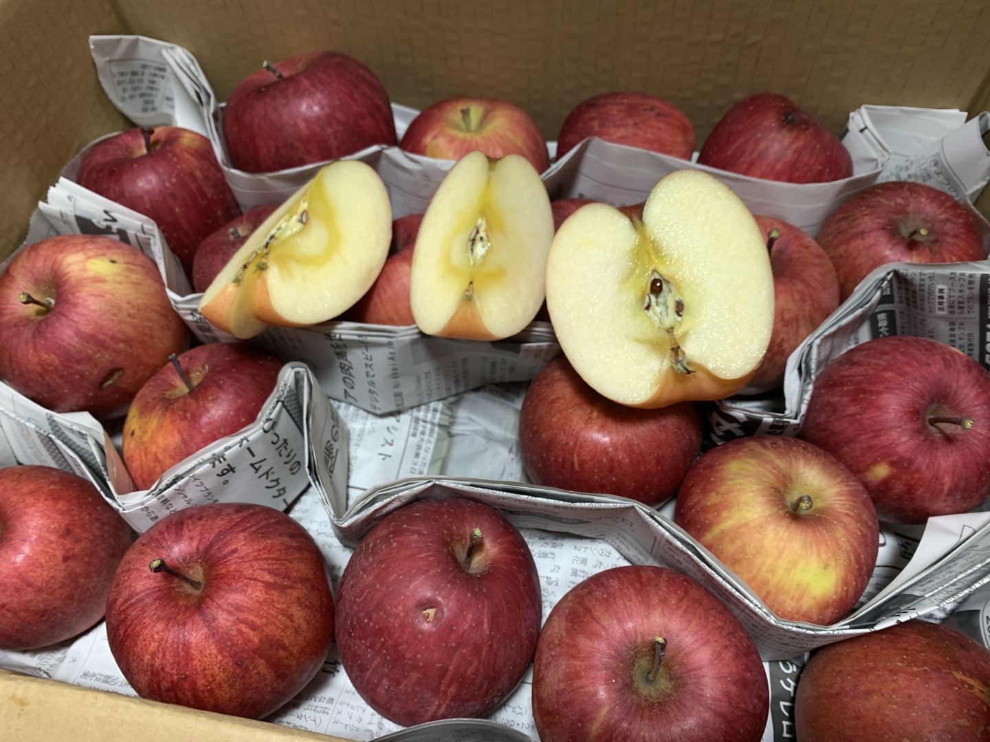 虫食いが交じる可能性大です。写真にあるように、りんごの内部に虫が食べた跡が残ってしまっています。また、被害状況が外から判断できないため、カットしたほうが良い部分が多くなってしまう、りんごがあります。