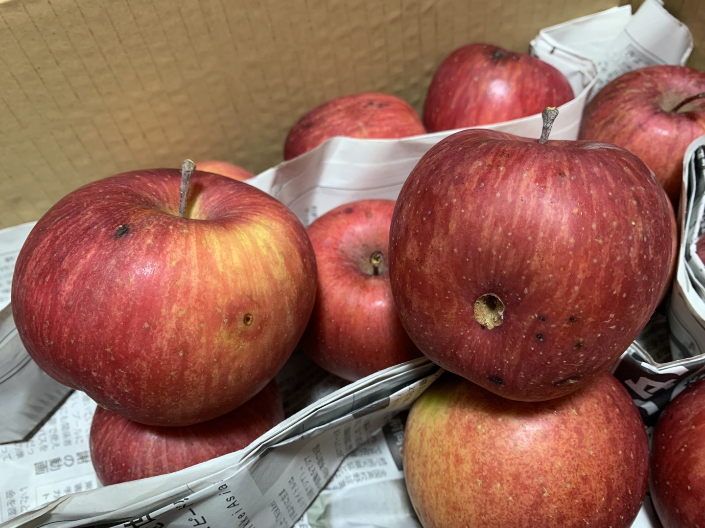 りんご サンふじ 約68% 農薬カット 20個くらい 小玉多め キズ等、黒点、虫食い混じり多め