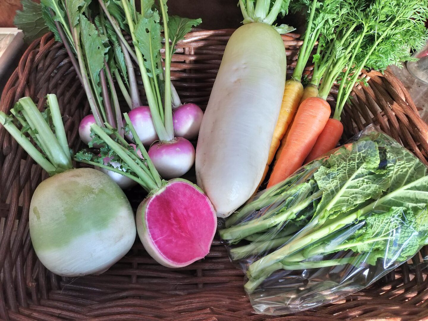 にんじん、大根、紅芯大根、かぶ、あやめ雪かぶ、ラディッシュ