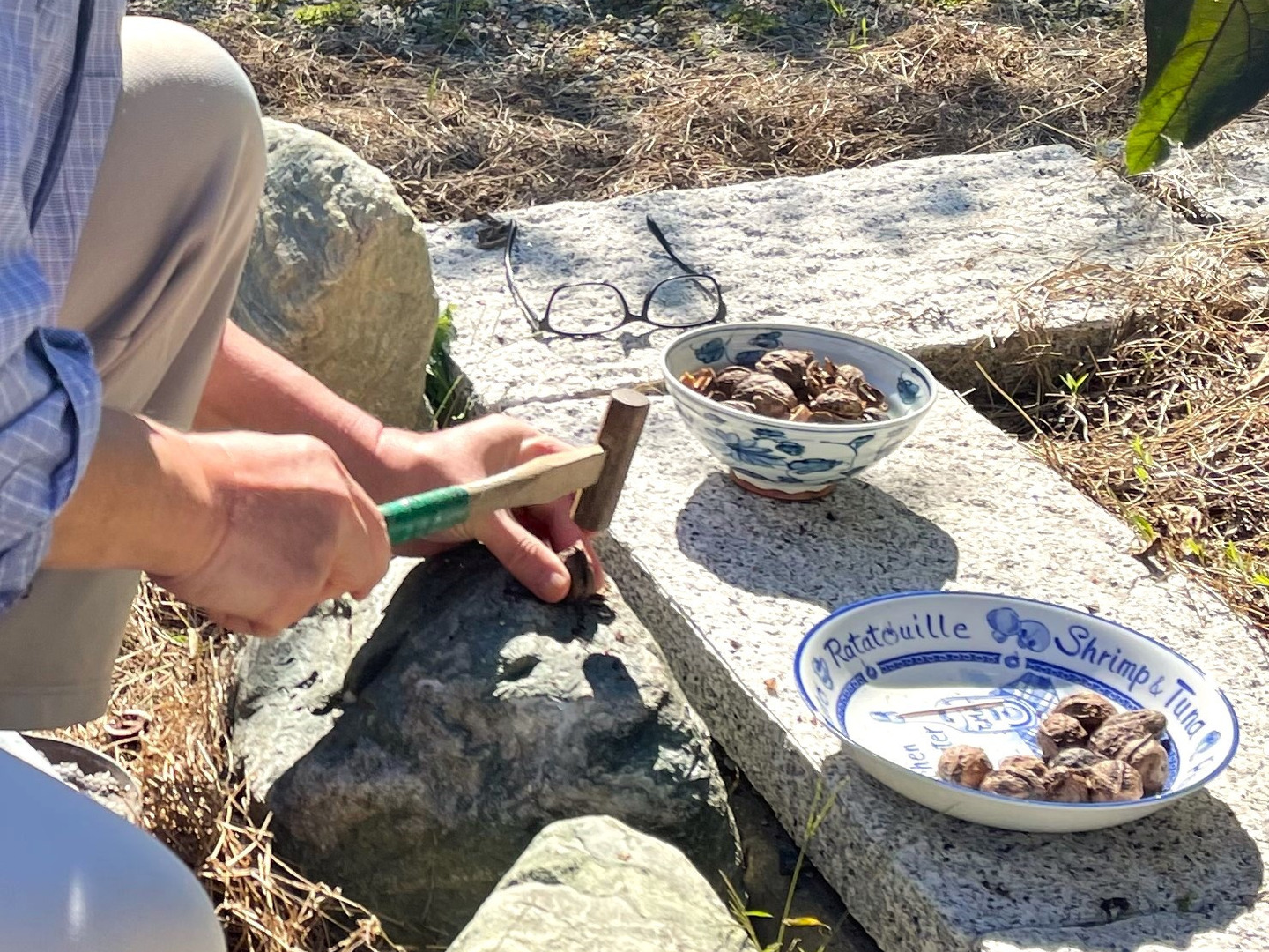 生で食べるには、くるみ割り機を使うか、くるみを立てて石の上などに置き、金づちで叩き割ります。クリーミーさは生クルミが一番かな?なんて、個人的には思っていますが、口に入るまでには忍耐が必要です。