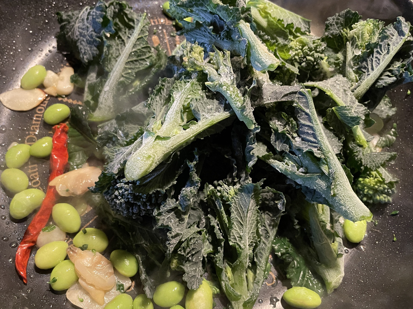 写真は、冷凍保存したアレッタを、アサリ、枝豆と一緒にオリーブオイルで炒めた一品です。アレッタの縮れた濃い緑色の葉が、他の食材の色味を引き立てます♪