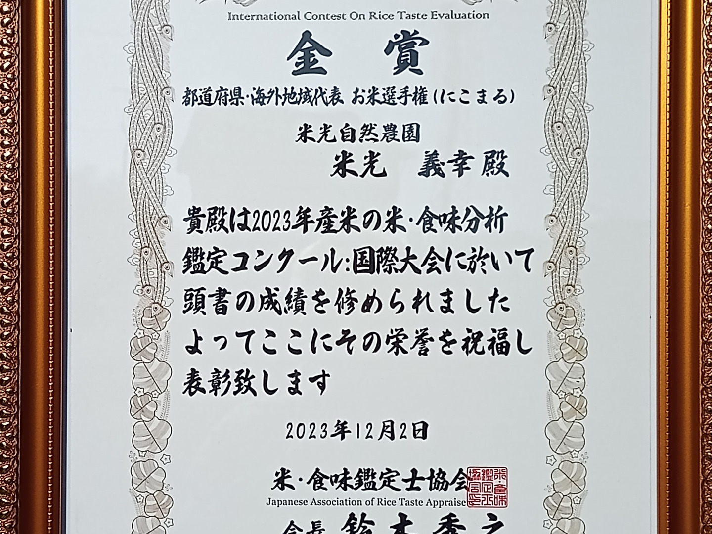 木村秋則さんが提唱する自然栽培農法で栽培した農薬・化学肥料を使用しない自然栽培米です。籾種は温湯消毒、除草剤等の農薬は一切使用しません。また、化学肥料も一切使用しません。令和5年12月1日、2日開催,お米のオリンピックといもいわれる第25回米・食味分析鑑定コンクール国際大会inつなん(5,092出品)の都道府県・海外地域代表部門で最高評価の「金賞」を受賞しました。 また、令和5年11月26日開催の 第7回九州のお米食味コンクール(1,311出品)の個人総合部門でも「金賞」を受賞(4度目の上位入賞)。安心・安全で美味しいお米です。是非召し上がってみてください