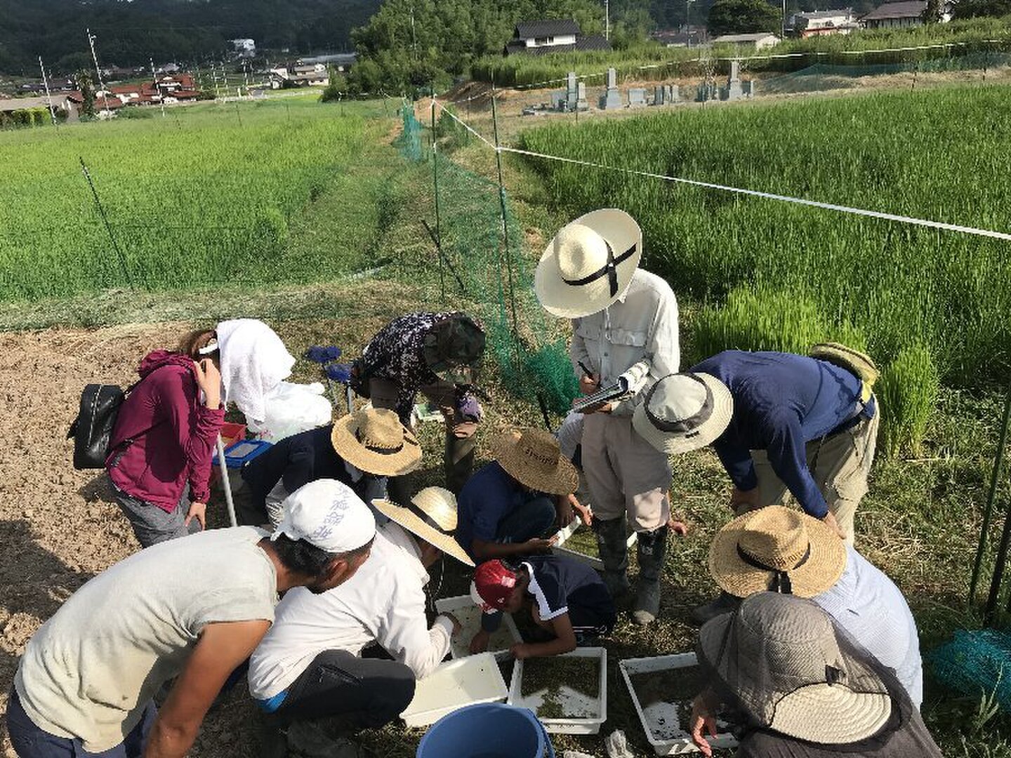 水中やイネの葉から生き物を採取し、『鳥類に優しい水田がわかる生き物多様性の調査・評価マニュアル』(農研機構)を参考にしながら、生き物の多様性を評価しています。小水路(ひよせ)の設置、草刈りの高刈り、中干し中止などの工夫により、毎年、最高ランクの『S』評価となっています。