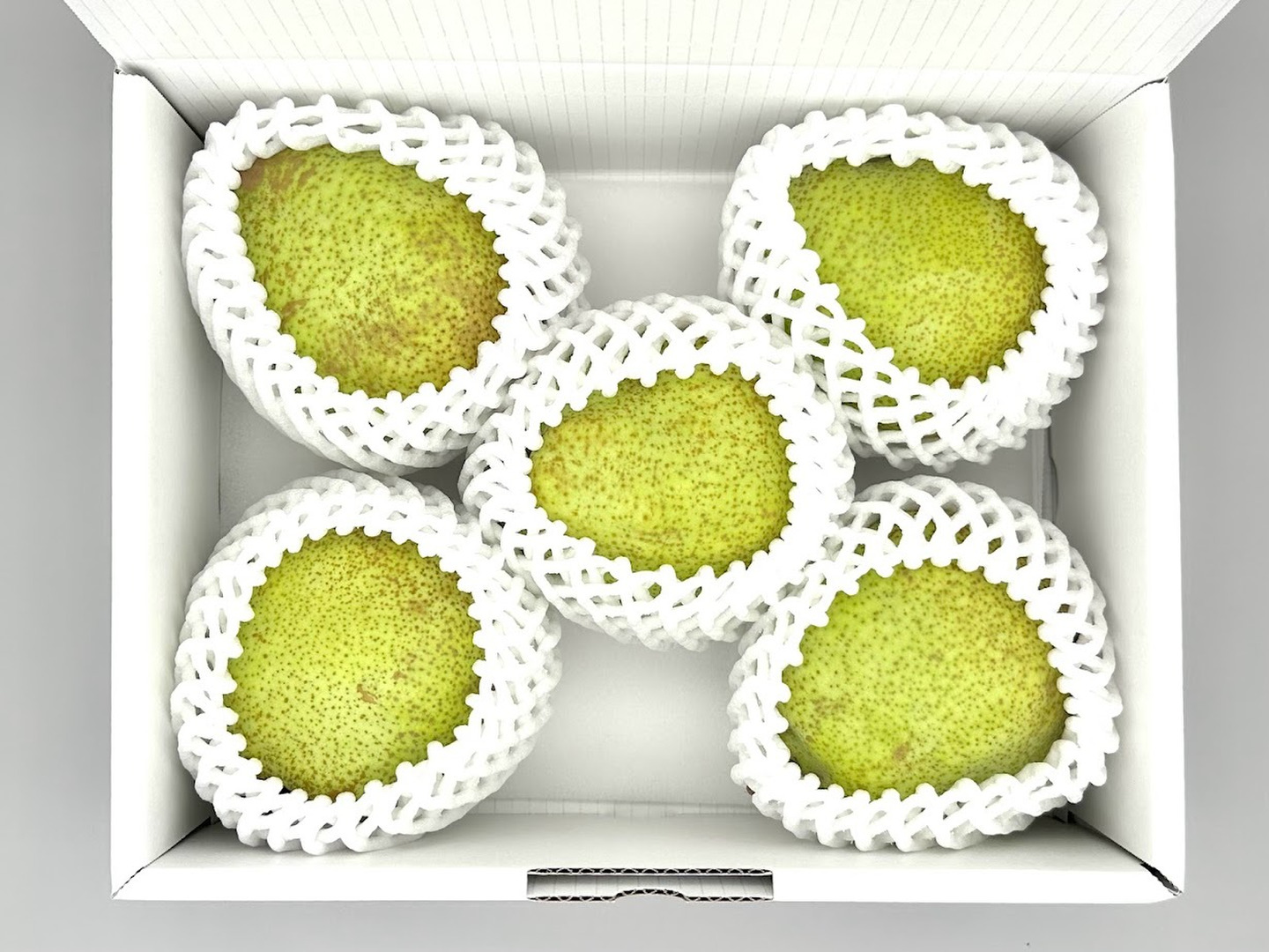 八ヶ岳南麓エリアの標高約800メートルの畑で、太陽の光が均一にたっぷりと当たるよう平棚栽培で育てました。果実に袋をかけ病害虫から守り、安心・安全・高品質にもこだわって生産しています。