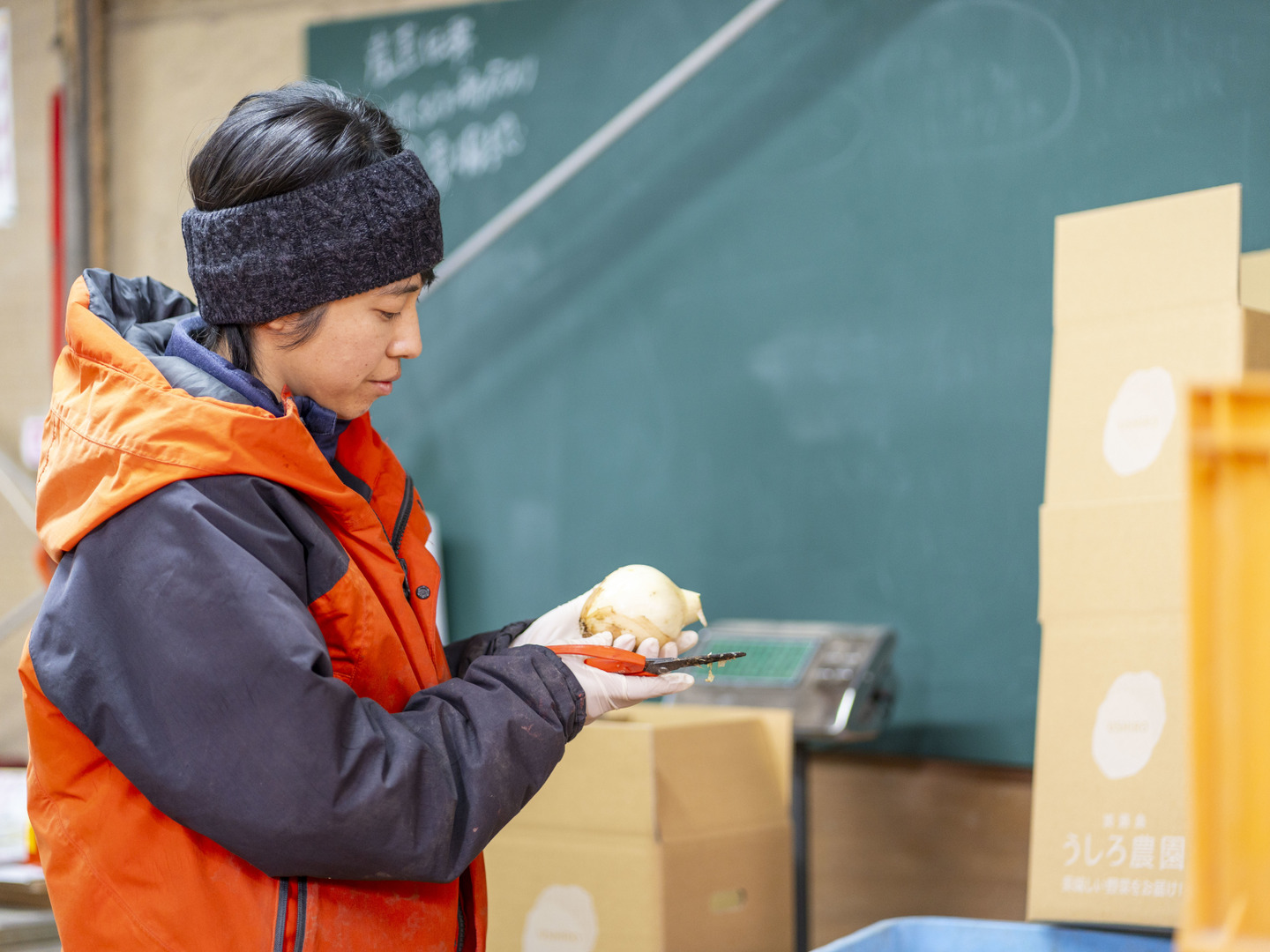 "うしろ農園は、竹肥料、魚肥料、ボカシ肥料などの有機肥料を時期により使用量を調整することで辛みを抑え、たまねぎの美味しさを引き出しました。
