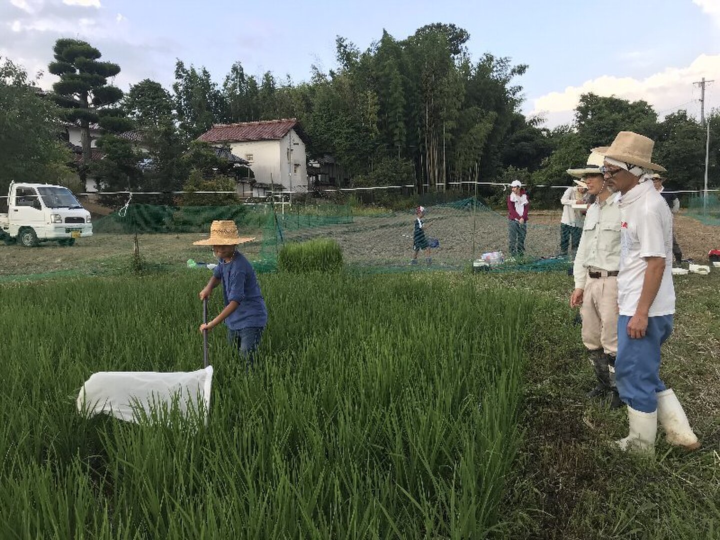 水中やイネの葉から生き物を採取し、『鳥類に優しい水田がわかる生き物多様性の調査・評価マニュアル』(農研機構)を参考にしながら、生き物の多様性を評価しています。小水路(ひよせ)の設置、草刈りの高刈り、中干し中止などの工夫により、毎年、最高ランクの『S』評価となっています。