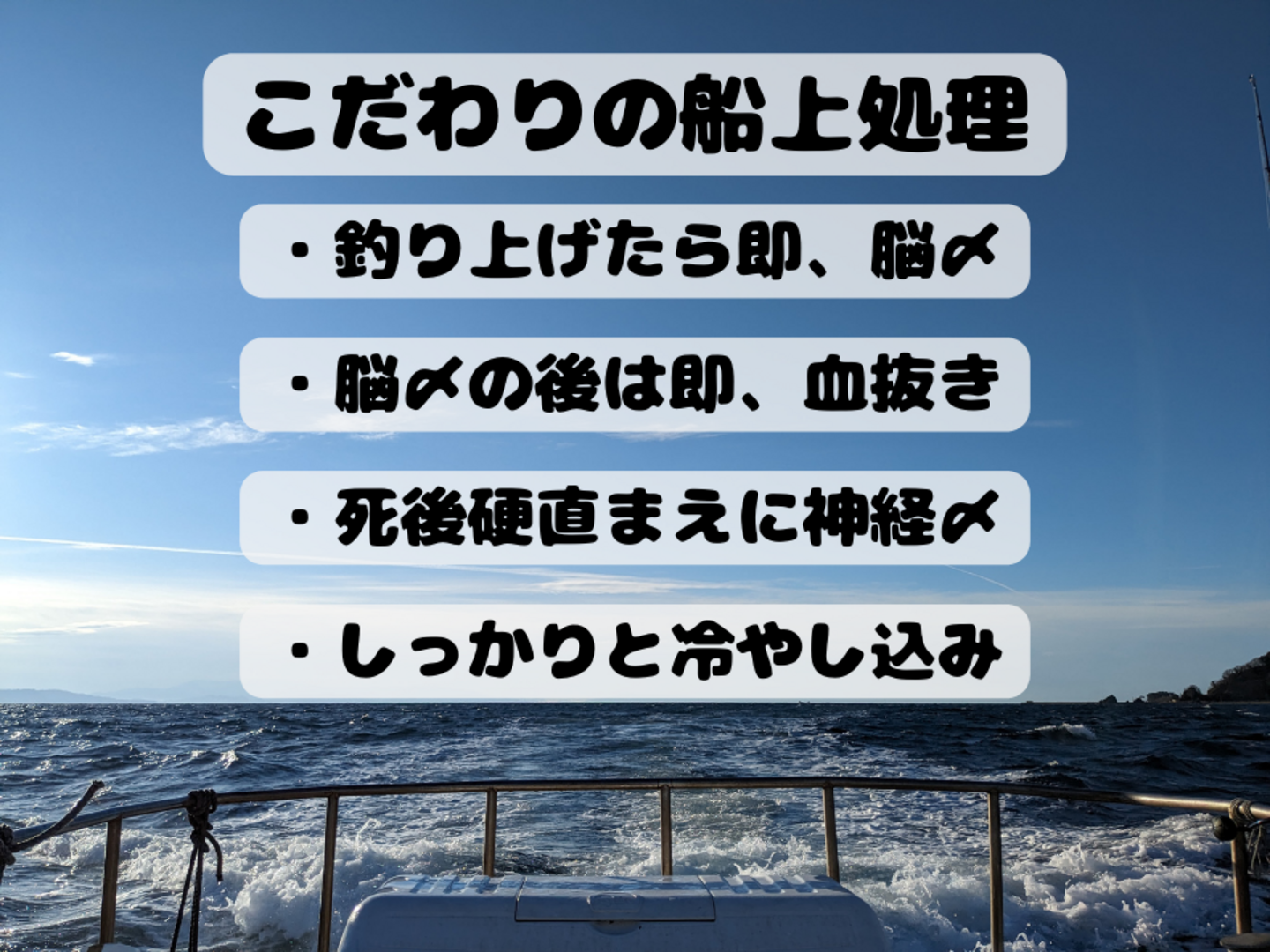 釣り上げた後、脳締め・血抜き・神経締めをし海水氷で冷やしこみます。