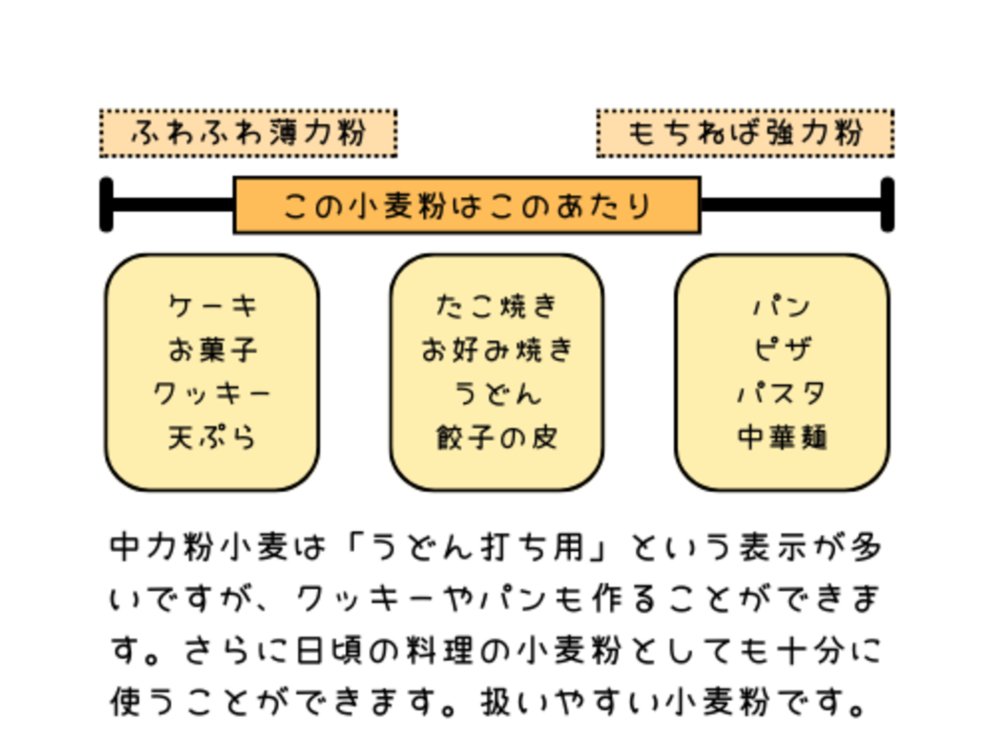 強力粉ほど、つくるお料理を限定しないいわゆる万能小麦とも言われます。