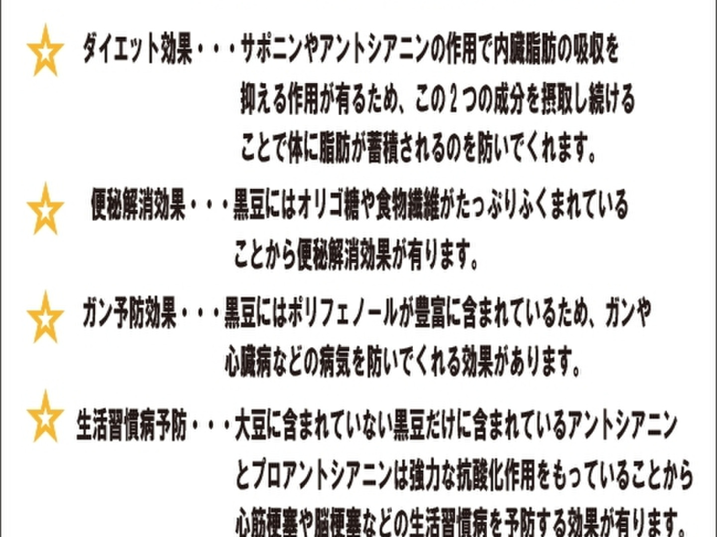 ☆便秘解消効果・・・黒豆にはオリゴ糖や食物繊維がたっぷりふくまれている