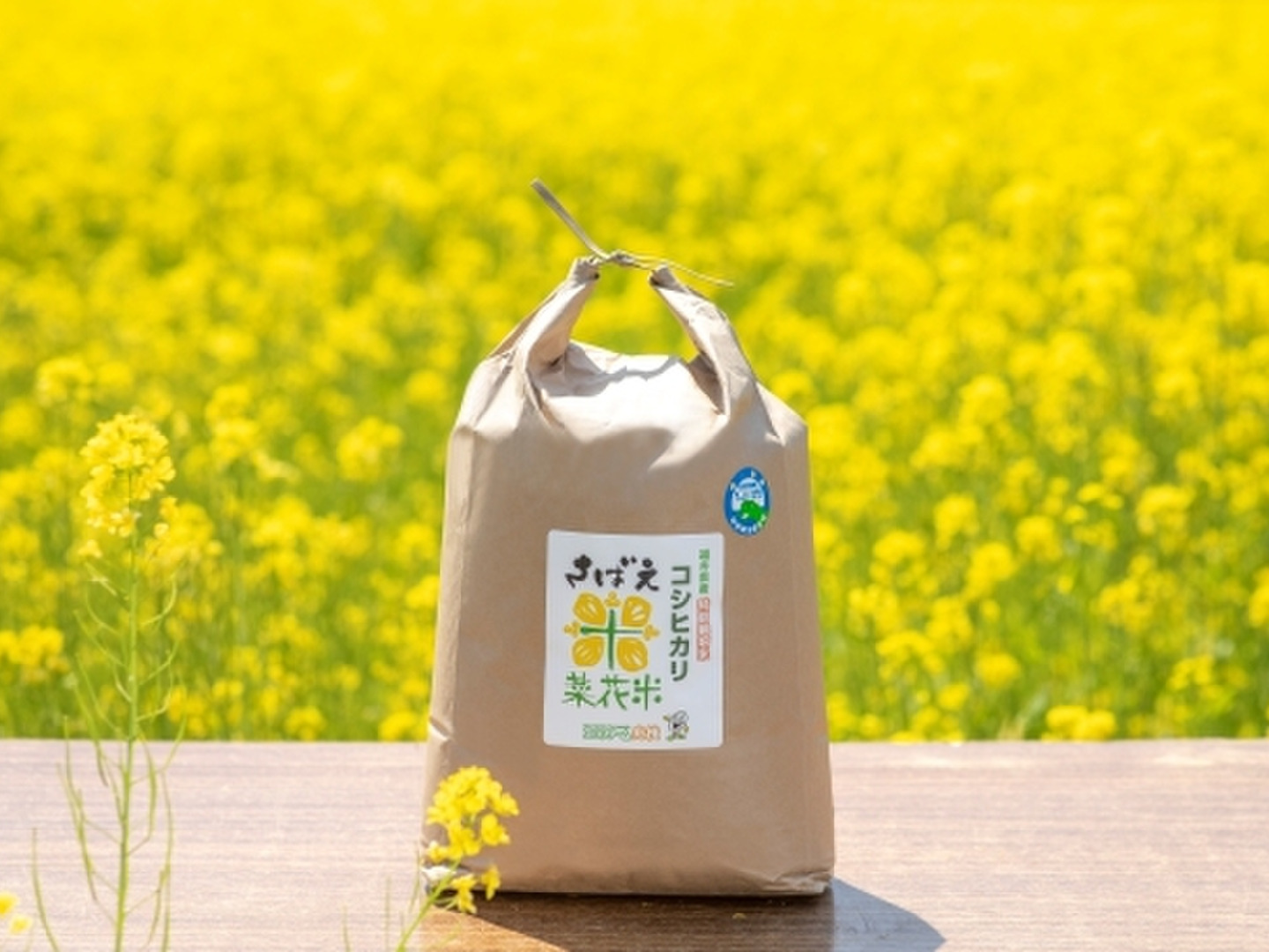 「さばえ菜花米」とは、秋の稲刈り取り後の圃場に菜の花の種を撒き、春には一面の菜の花の景観を楽しみ、その後それを鋤き込んで緑肥(有機肥料)として活用する方法で生産したお米のブランド名で、鯖江市が特産化を進めています。