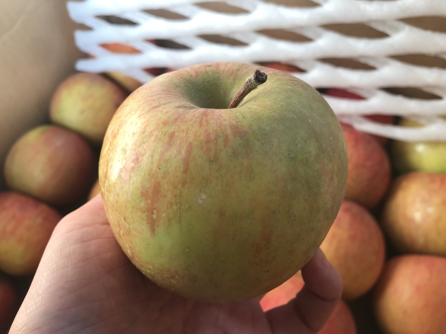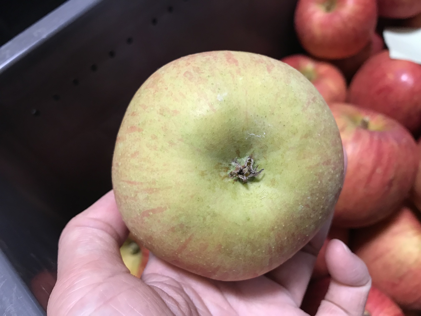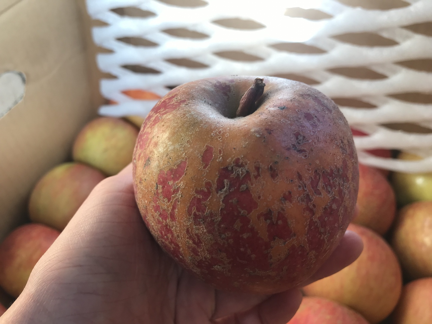 収穫直前まで葉から旨味と養分を送られたりんごたちは着色むらがありますが、養分豊富な力強いりんごに育っています。