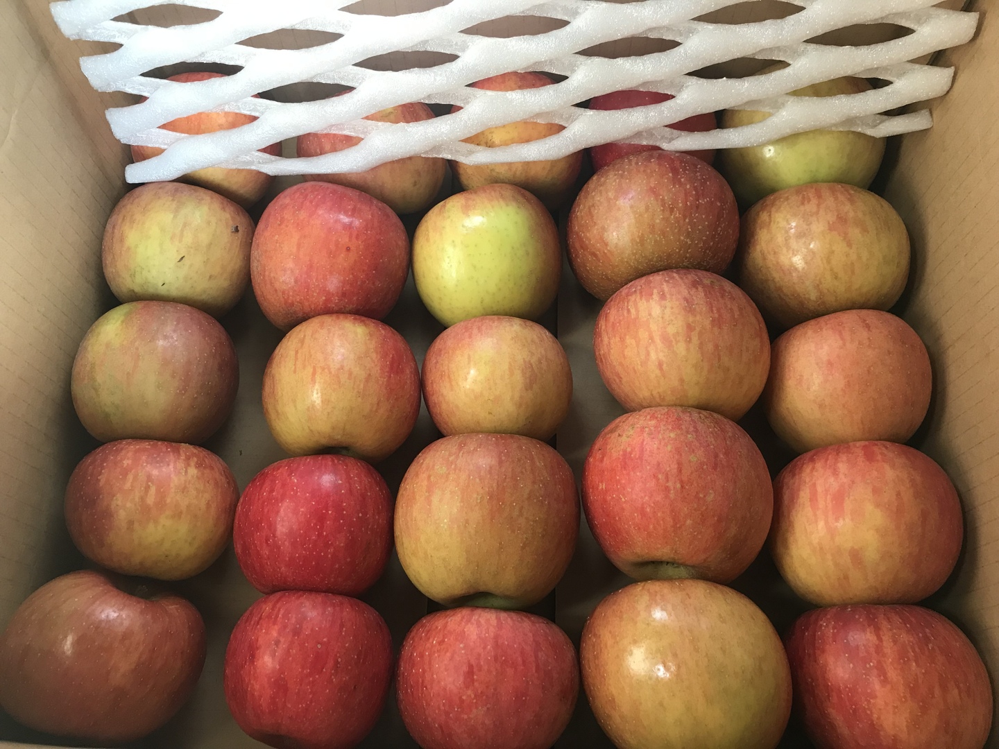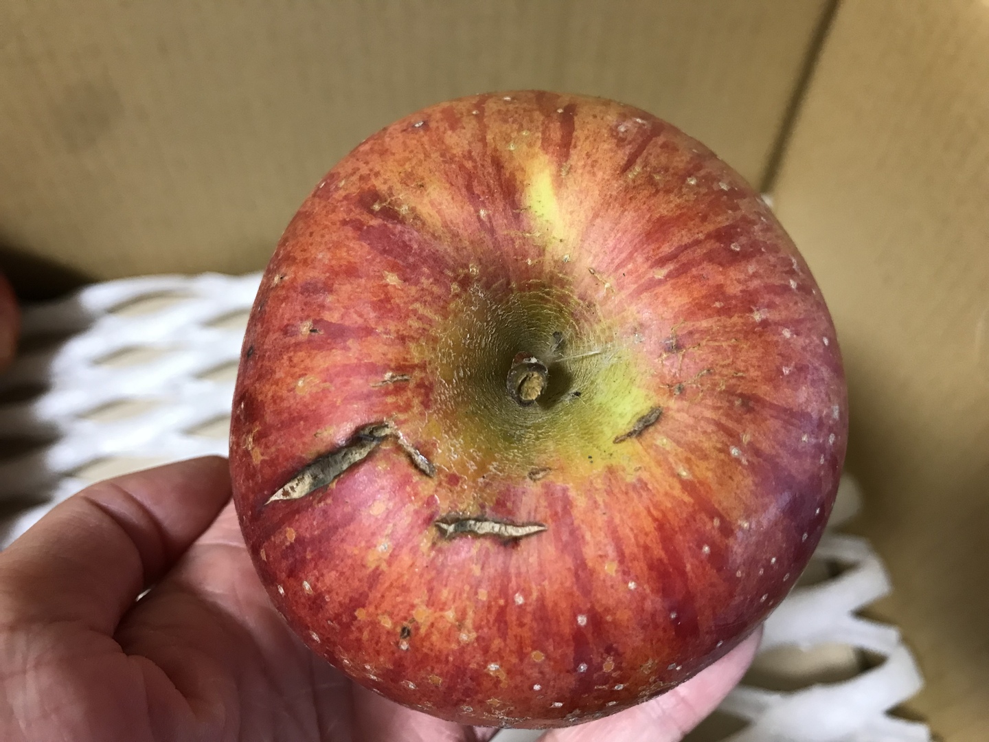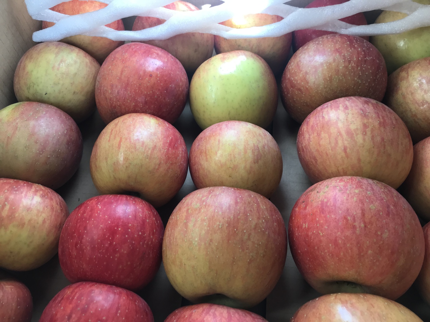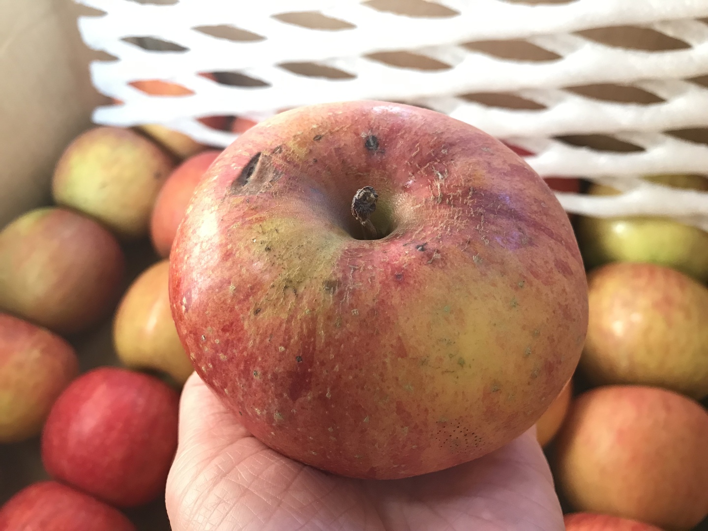 収穫直前まで葉から旨味と養分を送られたりんごたちは着色むらがありますが、養分豊富な力強いりんごに育っています。