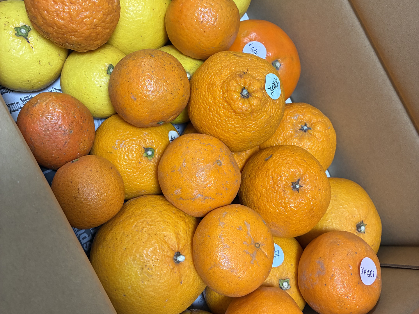 ○せとか…トロリととろける食感と濃厚でジューシーな味わいが特徴で柑橘の大トロと呼ばれます。果実同士や葉っぱにこすられてキズやシミがついていたりしますが、品質には問題ありません。ご家庭用としてお召し上がりください。