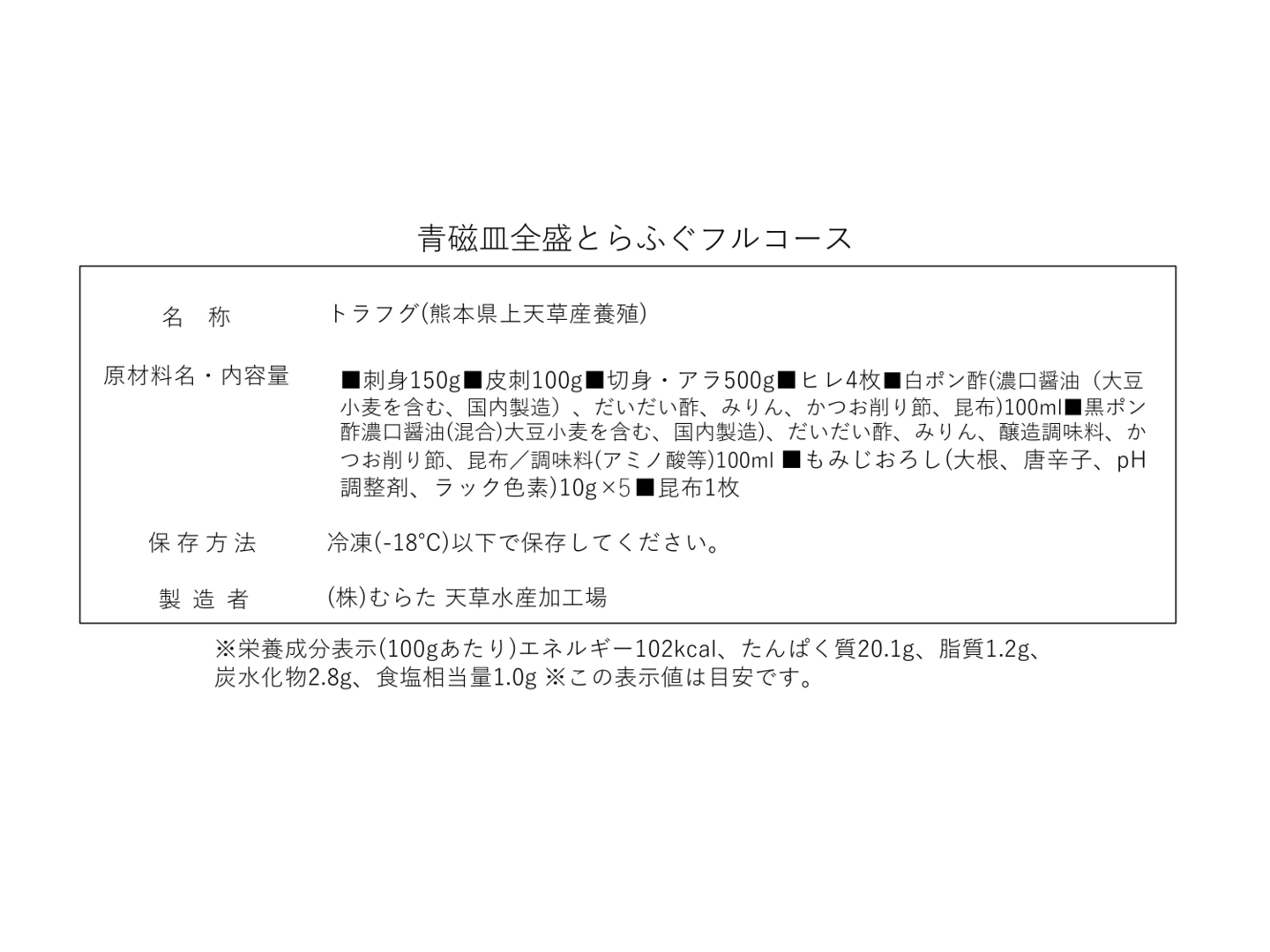 | 内容 | 刺身150g(34cm青磁皿全盛) 皮刺し100g 切り身/アラ500g 白子100g 焼きひれ4枚 白ポン酢100ml 黒ぽん酢100ml 昆布1枚 もみじおろし10g×5 | ||||||