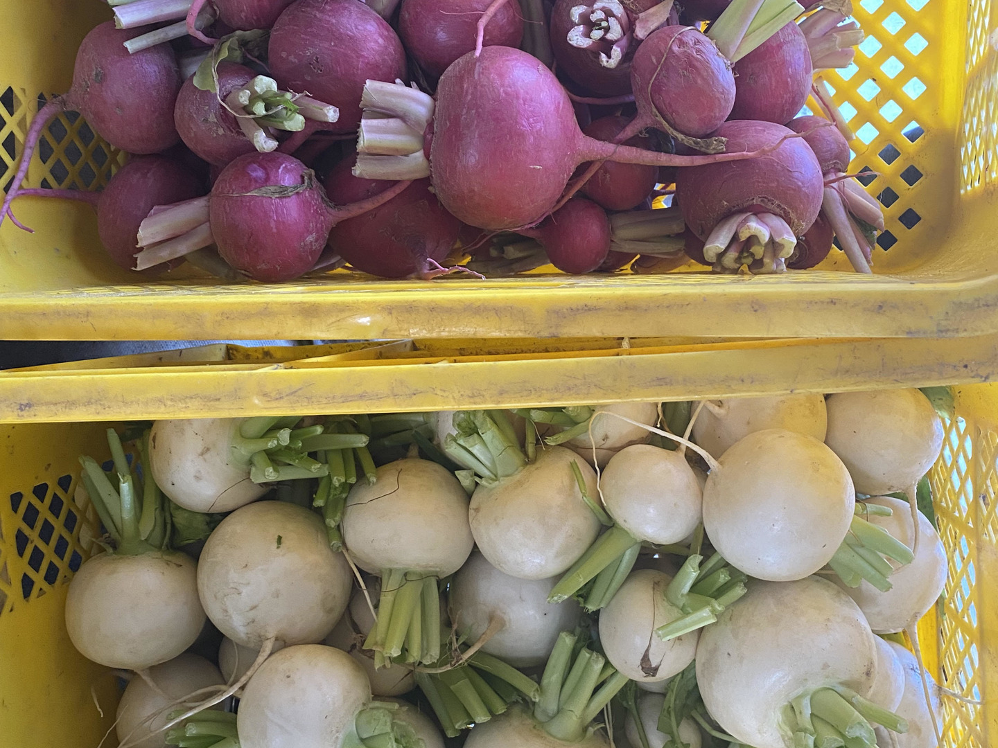 新玉ねぎ、スナップえんどう、キャベツ、水菜、じゃがいも、ビーツ、白菜つぼみ奈、春菊、そら豆、ブロッコリー、ニンニクの芽、ニラetc