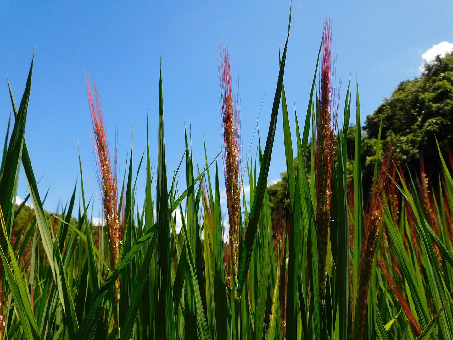 赤色の稲穂は赤米です。今年も美しい景色で田んぼを賑やかにしてくれました。いただくと、モチモチ、プチプチとした食感も健在です。