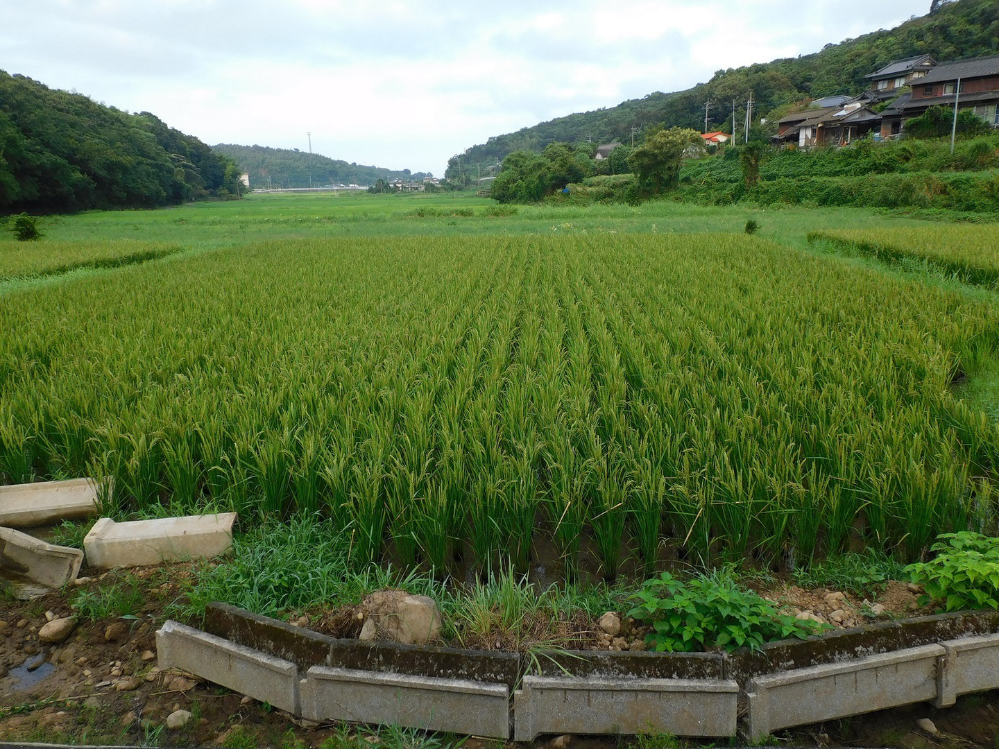 一見すると普通のうるち米のように思える黒米(朝紫)の田んぼでは、7月の大雨で山水が入り込み、水路が壊れてしまいましたが、田への入水は行うことができたため、無事に収穫することができました。