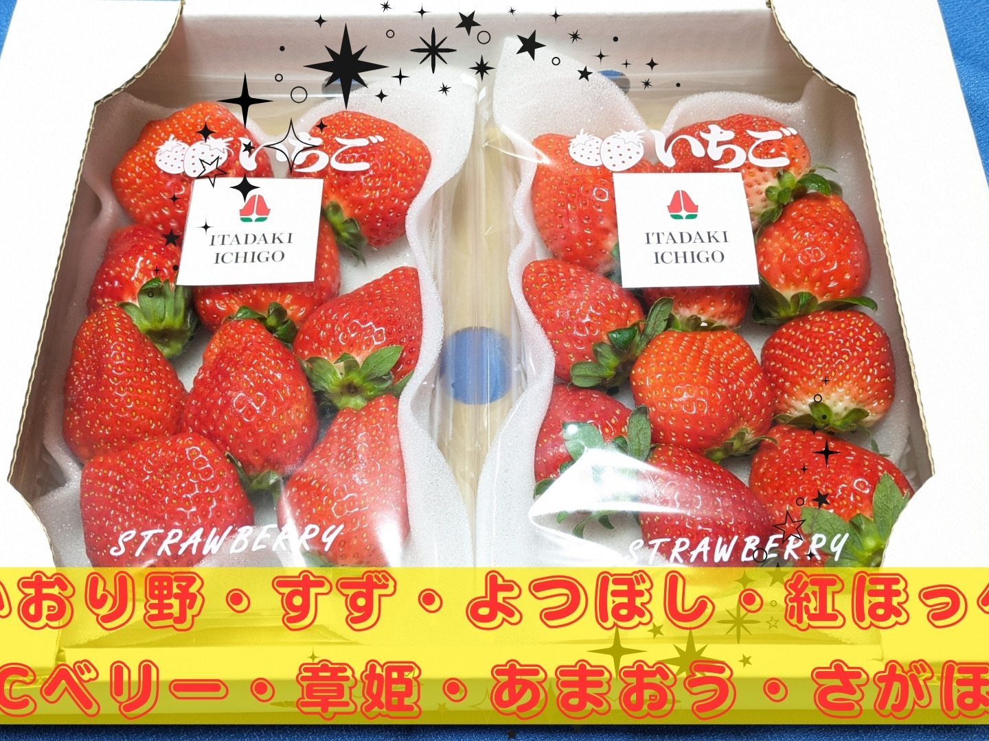 かおり野・すず・よつぼし・紅ほっぺ・おいCベリー・章姫・あまおう・さがほのかの中から当園の目利きスタッフが旬な2品種を厳選してお届けする食べ比べセットです。どの品種が届くかはお楽しみ♬
