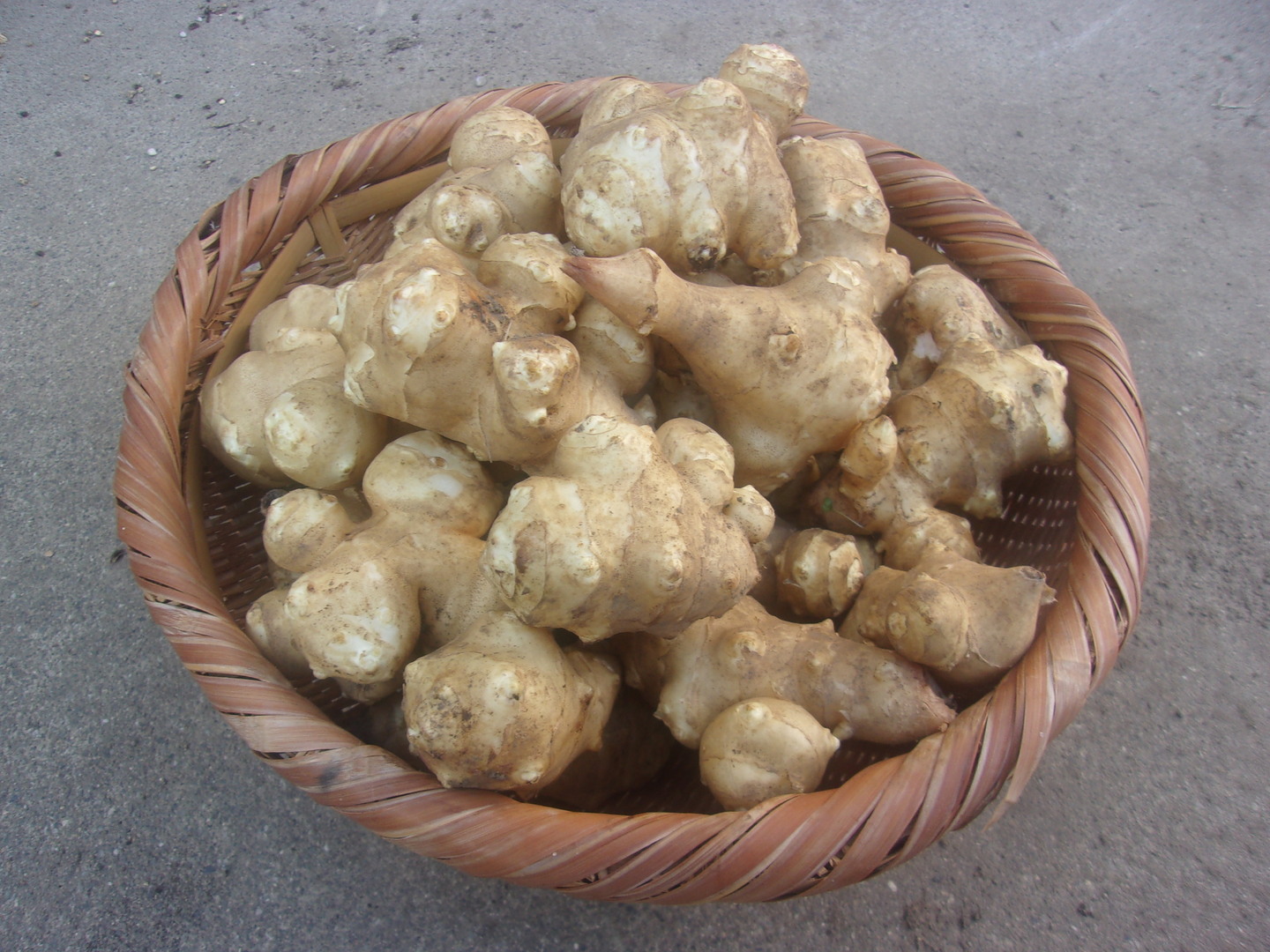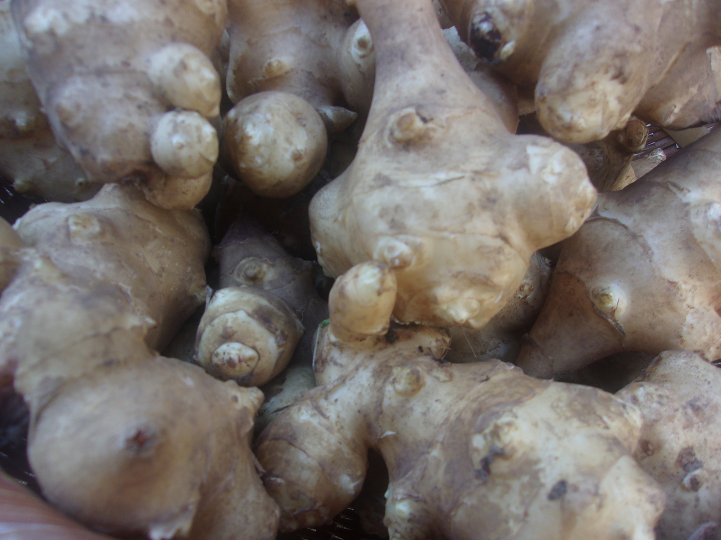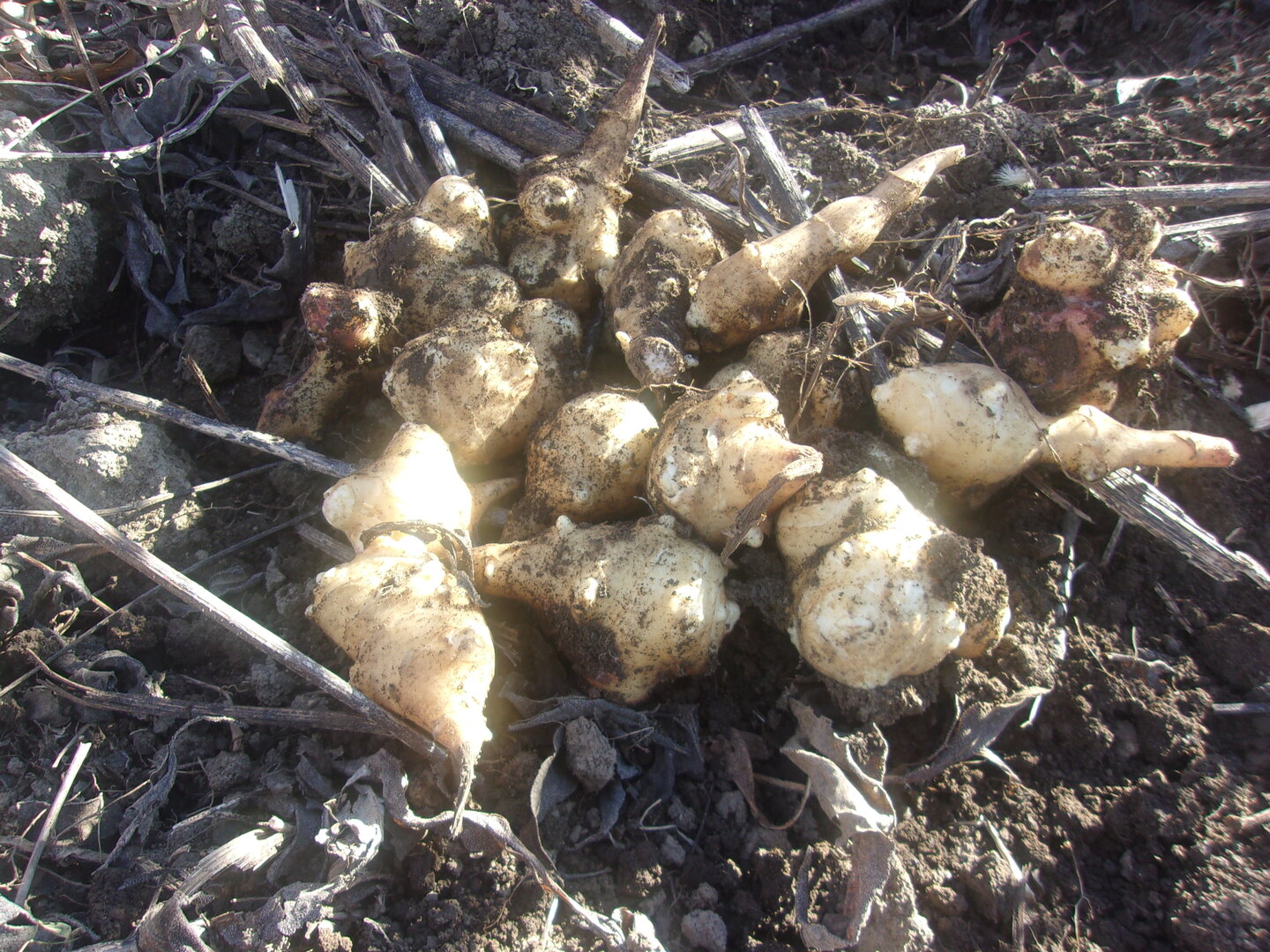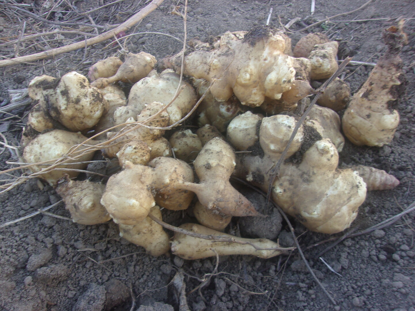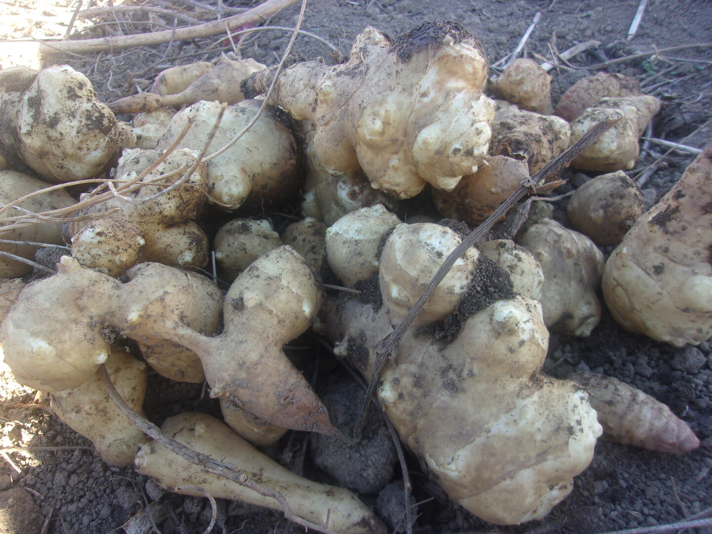 表皮が白い菊芋です。形状はショウガのようにゴツゴツしています。