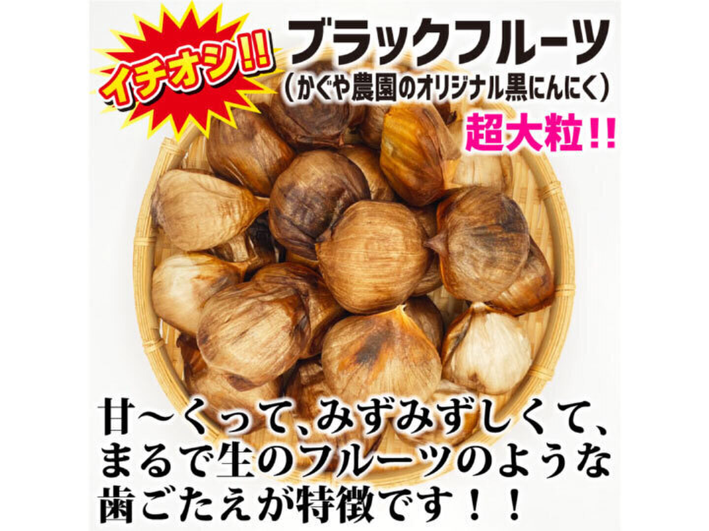 かぐや農園が独自に開発した、超大粒でフルーツのような食感が特徴の、甘~くってとても身体に良い黒にんにくです☆