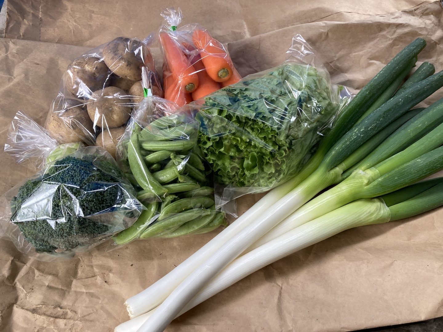 にんじん1k 、じゃがいも1k、スナップ500g、深ネギ4本、リーフレタス1個、ブロッコリー1個