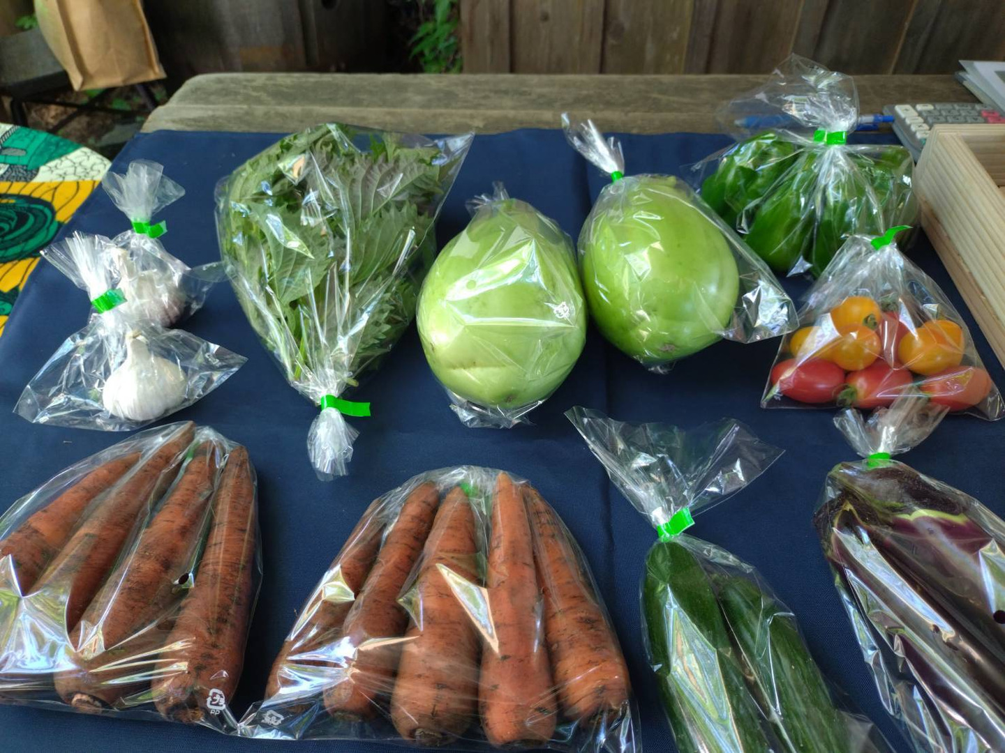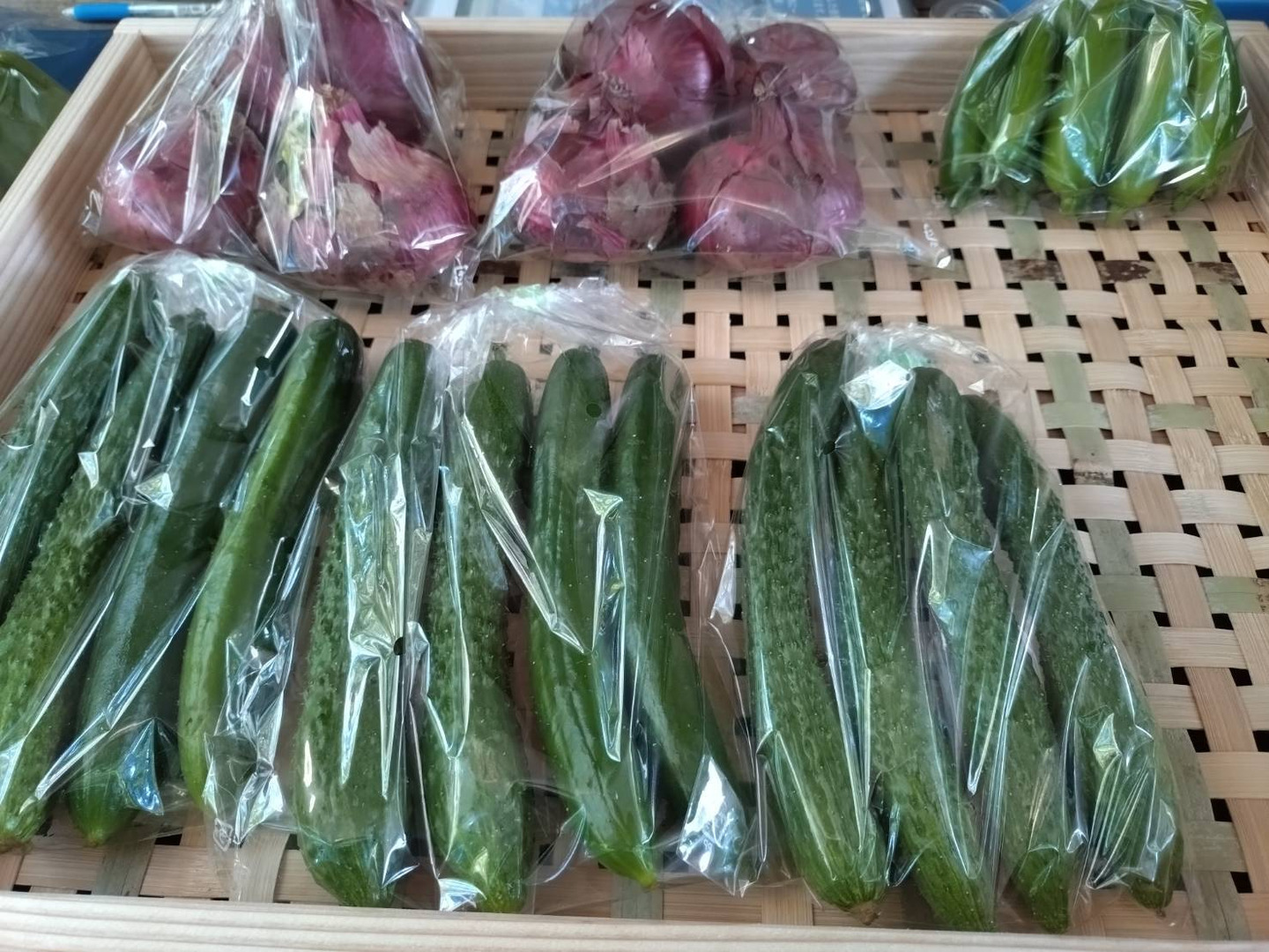 オクラ、丸オクラ、かぼちゃ(1個丸ごとではなくカットしています)、ゴーヤ、三州生姜(小生姜・新しょうが)※、きゅうり、四葉きゅうり、ミニトマト(ミックス)、つるむらさき、モロヘイヤ、空芯菜、にんにく、じゃがいも(赤・紫・桃色)、なす(トルコなす・シルクボーイ・白丸なす・水なす・翡翠なす・長なす・ゼブラ長なす・イタリア丸なす)、青じそ(枝つき)、ハラペーニョ※