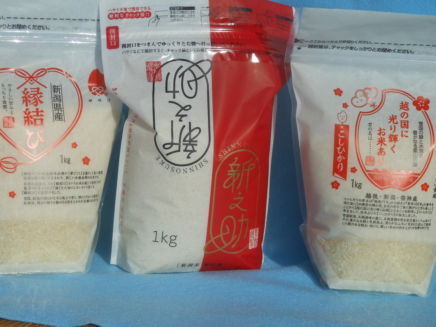 新潟産のお米で【こしひかり】と【新之助】と【恋の予感】と【ひとめぼれ】と【縁結び】と【こがねもち】です