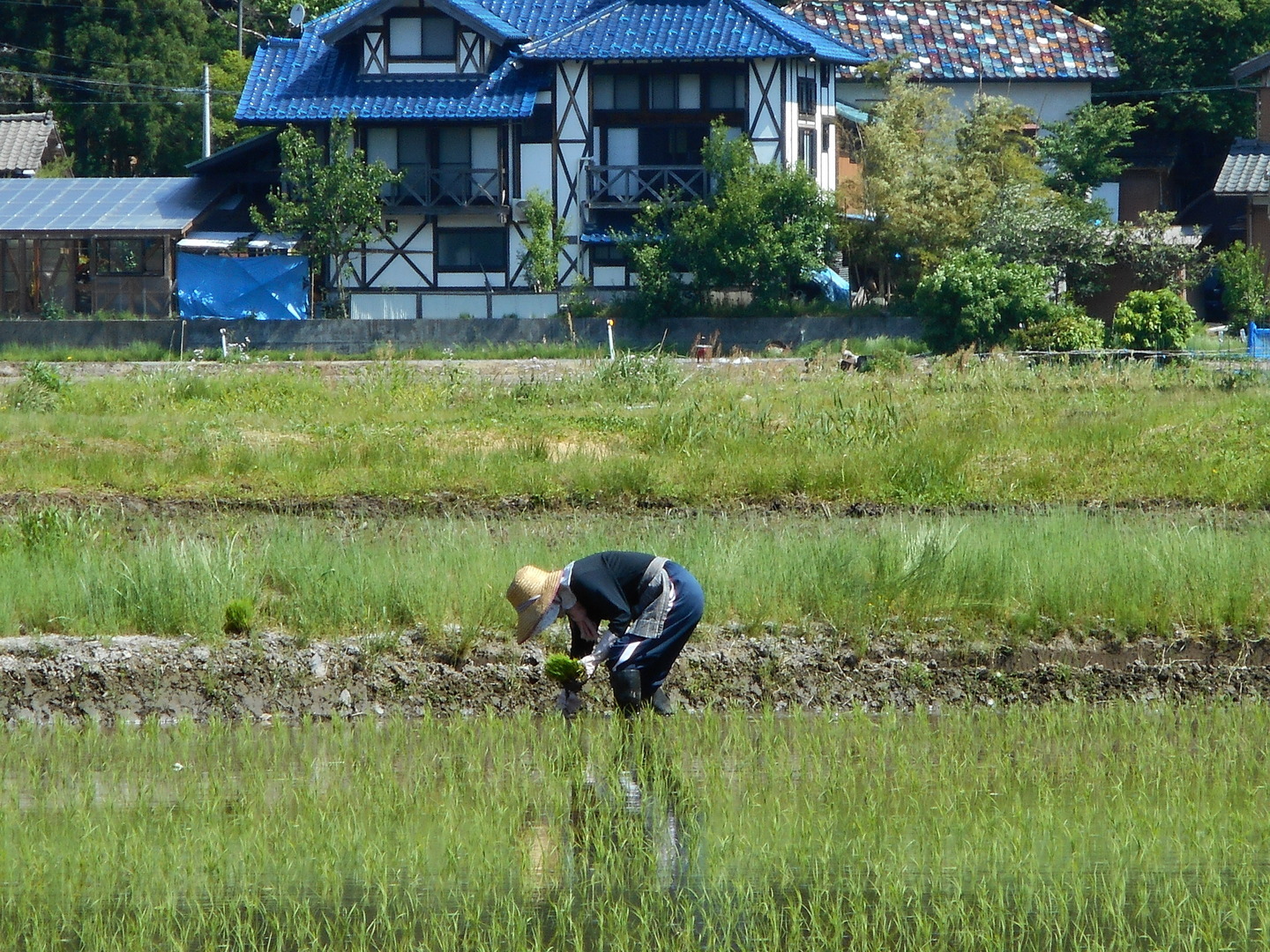 - 1 このお米を食べていただき、皆様との、良き、田舎暮らしの百姓と、ご縁が有りますように、【縁結びの田んぼで雨天が続き手刈りをしている風景】