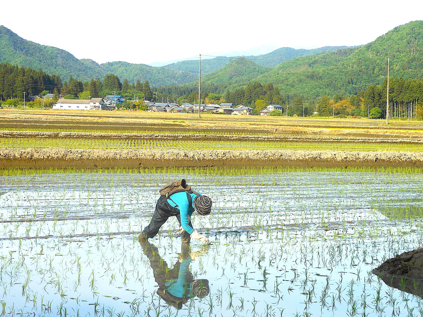 - 3 遠くに連なる緑り豊かな山々と初夏の水田地帯に【こしひかり】や【新之助】と【恋の予感】や【縁結び】と【ひとめぼれ】と【こがねもち】などの7品種を栽培しています