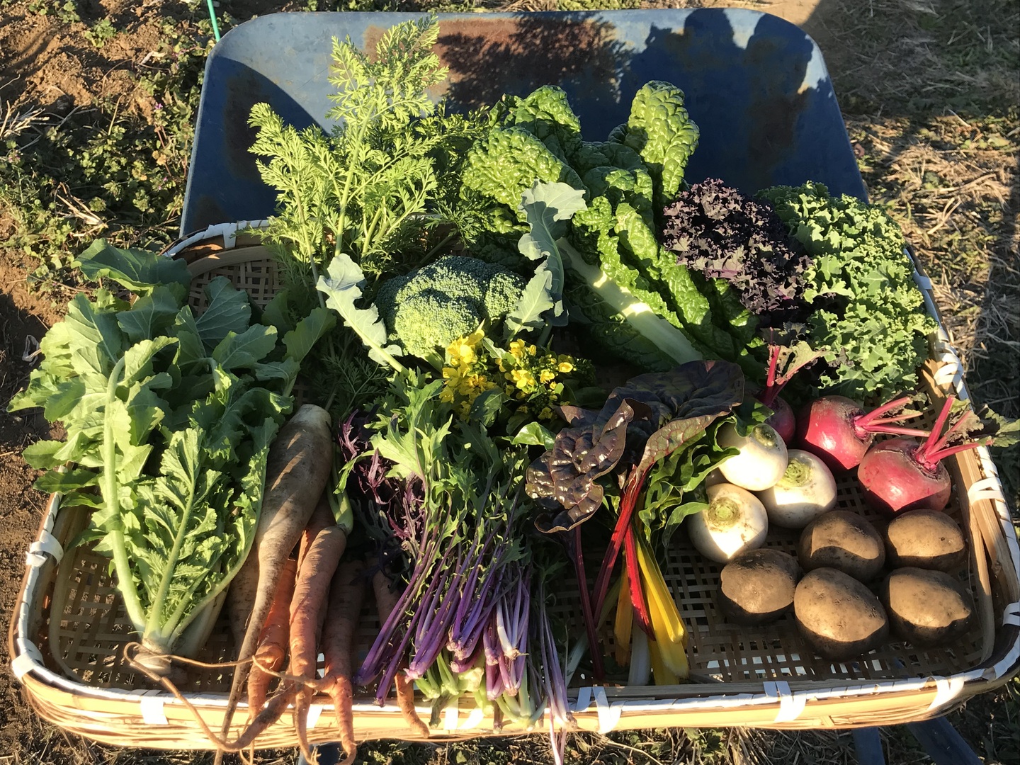 三浦大根、カラフル大根(赤・紫・紅芯・青長・黒皮)、山内一尺にんじん・カラフルミニにんじん(赤・白・紫・黄色)、里芋(土垂小芋または親芋)、葉付き白小かぶ、レタス(サニー・フリル)サラダ小松菜、赤軸水菜、赤サラダからし菜、カーリーケール(緑・紫)、博多かつを菜、スイスチャード(赤・黄色・白)、カーボロネロ、ミニコールラビ、スティックブロッコリ、冬菜花、イタリアンパセリ、パクチー