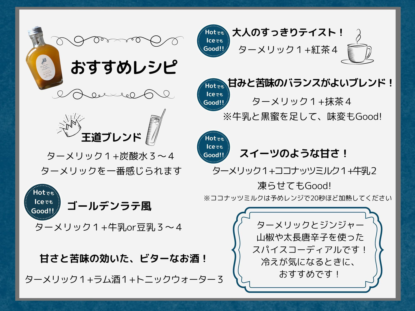 本品は庄内産ターメリックが持つ苦味と力強い香りをお楽しみ頂けるように生で丸ごとピューレ状にし、選び抜いたスパイスと共に煮出したスパイスコーディアルです。