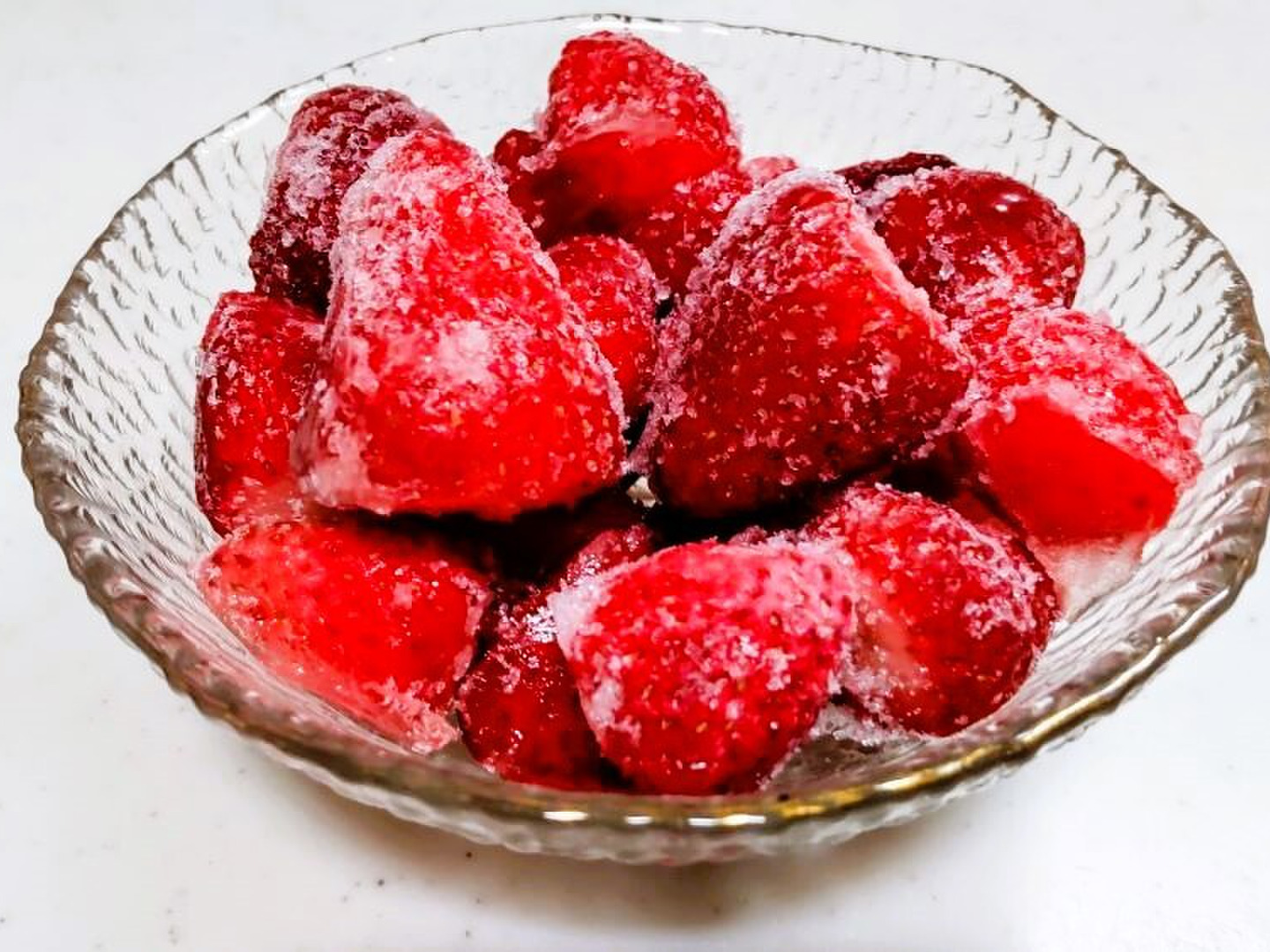 ヘタを取り水道水を掛け流した後、冷凍しています。粒の大きさは大小さまざまになります。