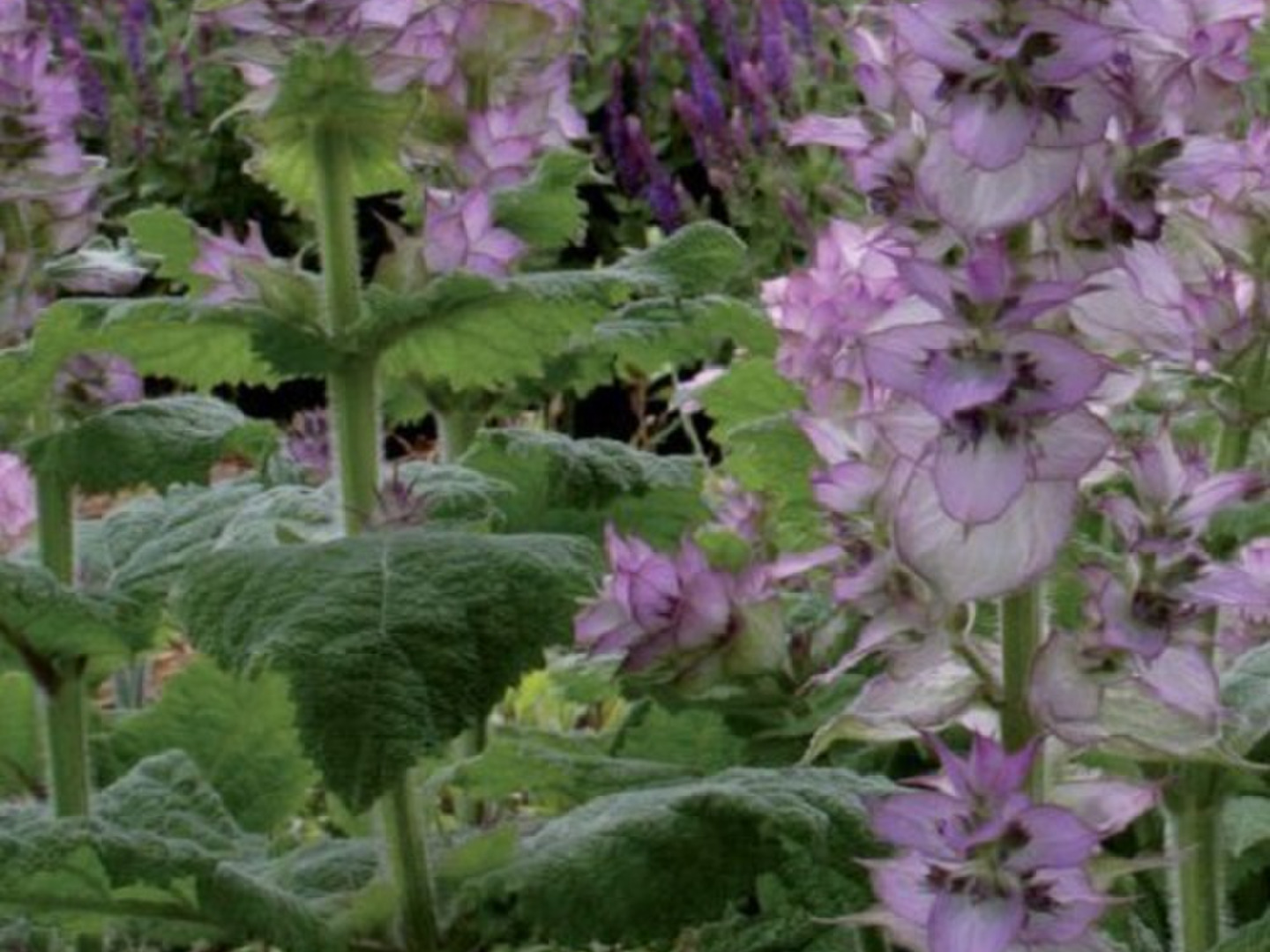花茎が伸びる高性のサルビアです。花茎が分岐しながら苞が青紫、赤紫、桃色に変化します。