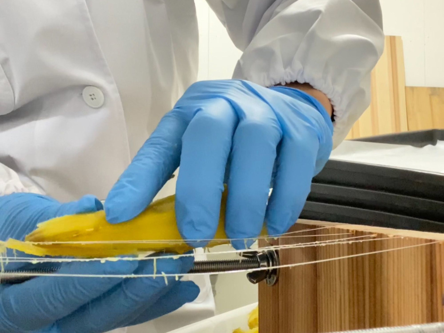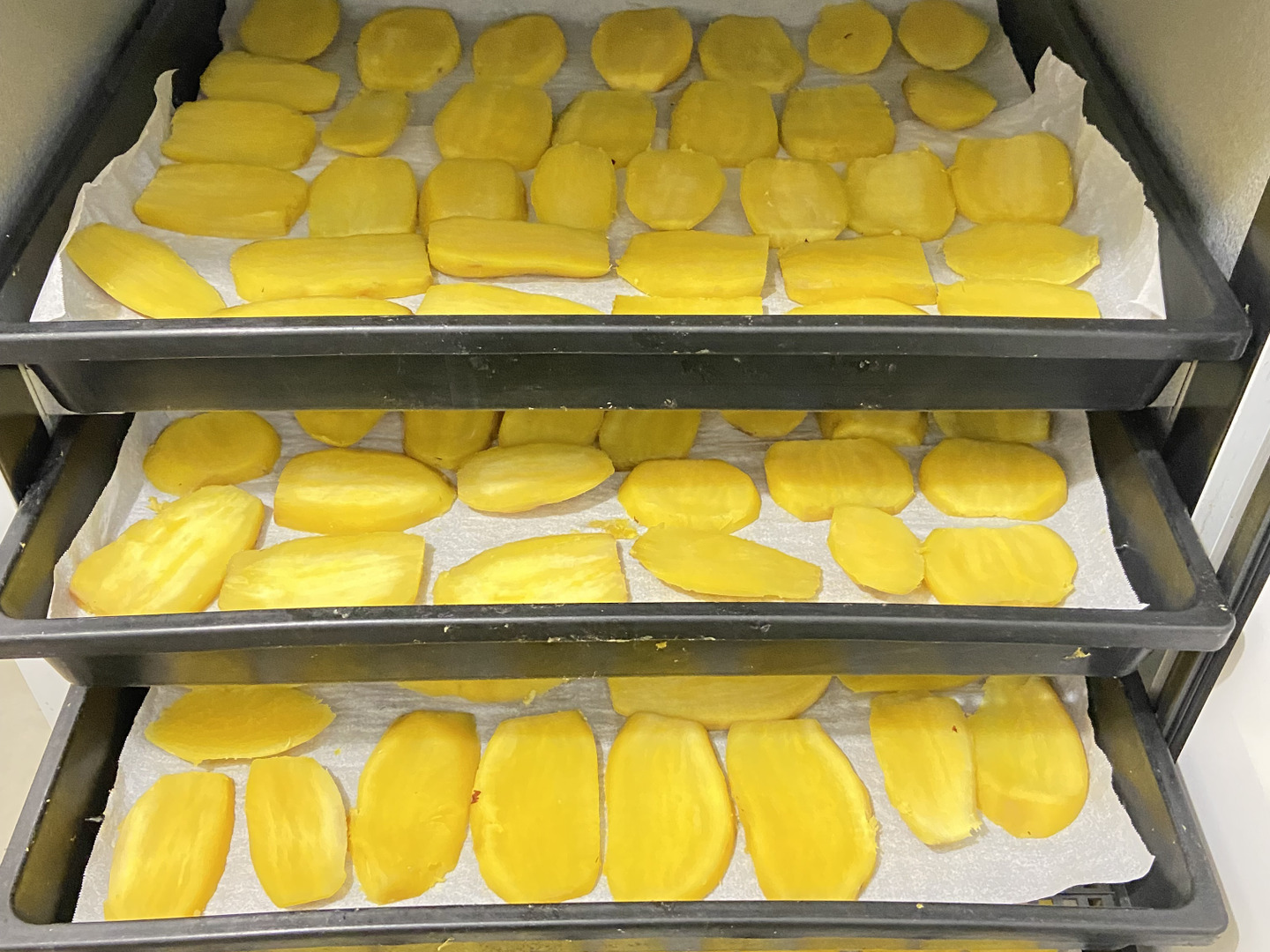 1枚づつスライサーで切り分け、24時間の低温乾燥を行い、寒風で仕上げ干しをしました。