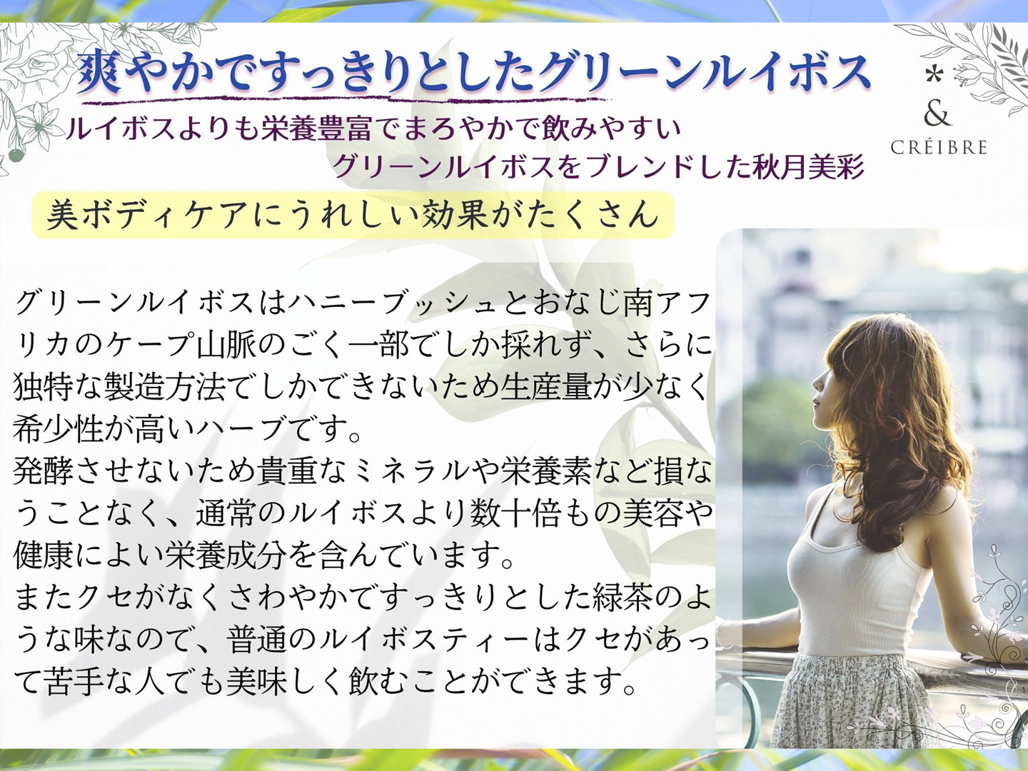 – 【グリーンルイボス】美容にうれしい効果がたくさんで含有率も豊富。