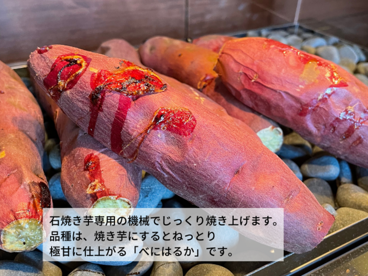 まるも農園のべにはるかを3ヶ月以上かけて熟成させて、糖度が高くなったものを厳選し、200度で60~90分かけてじっくりと焼き上げました。べにはるかのねっとりとした食感と濃厚な甘みが最大の特徴です。