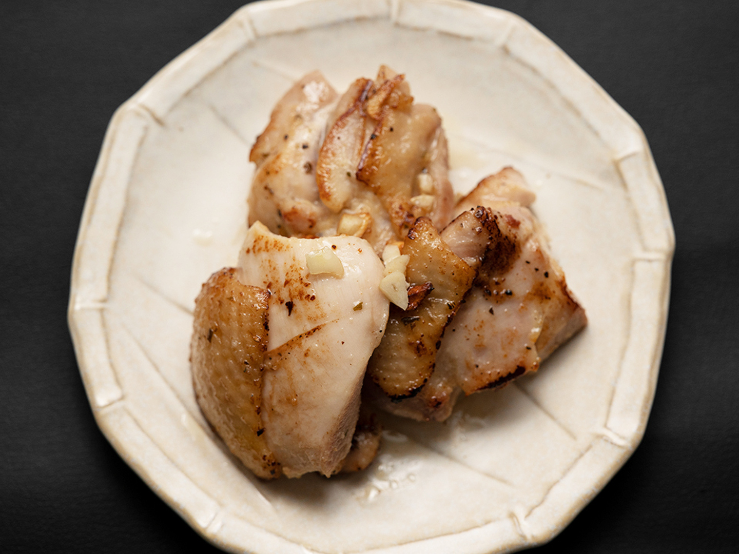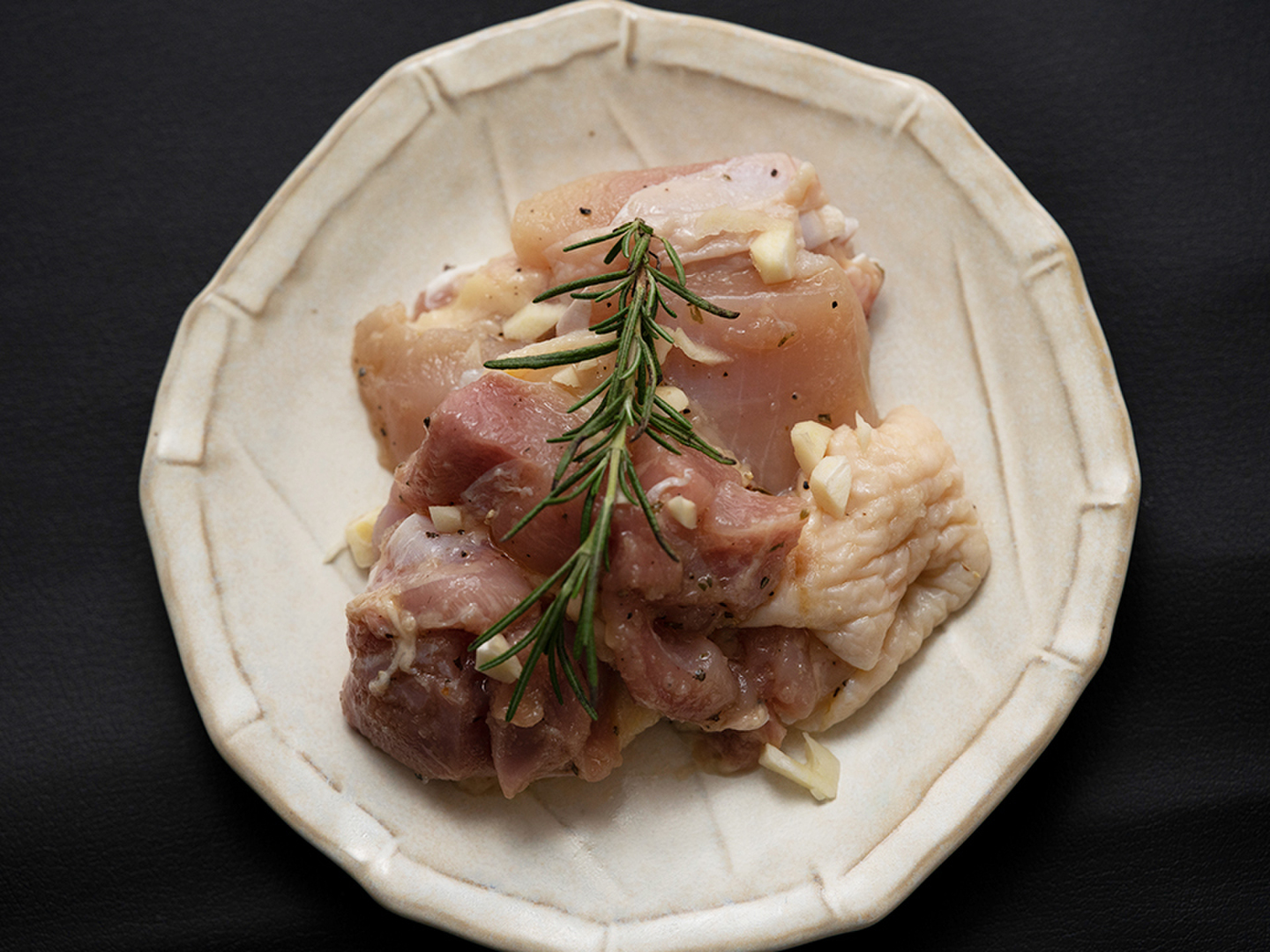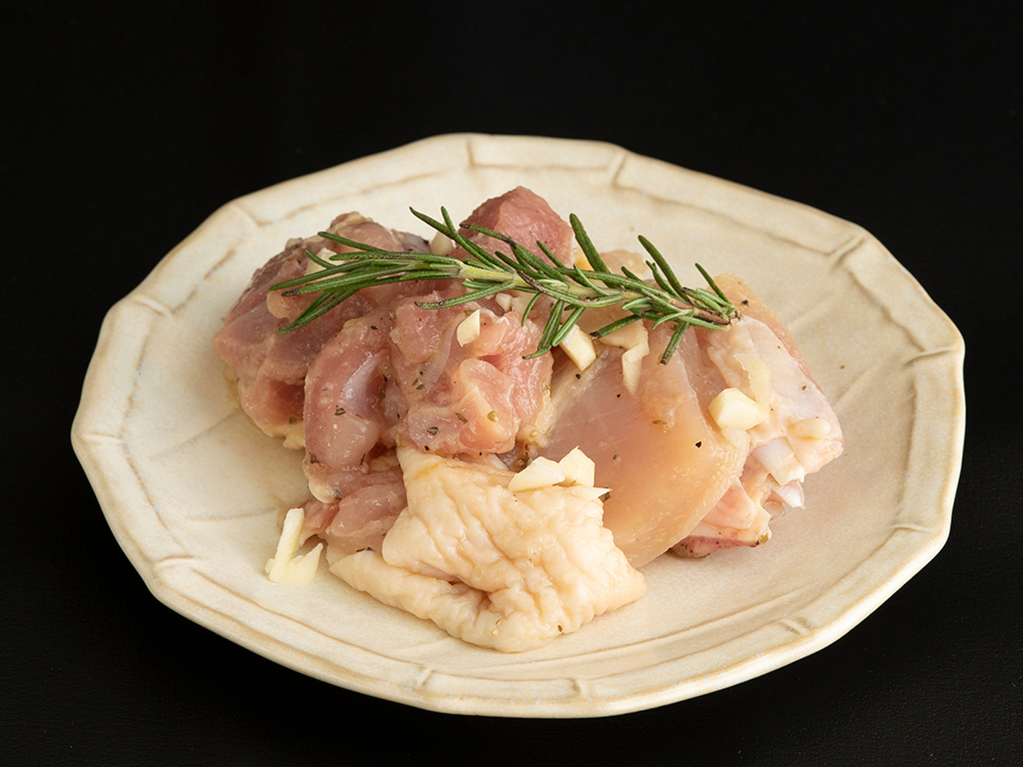 ハーブ鶏の濃厚な味わいと弾力、ニンニクの香りで、ワイルドな味わいに仕上がっています。