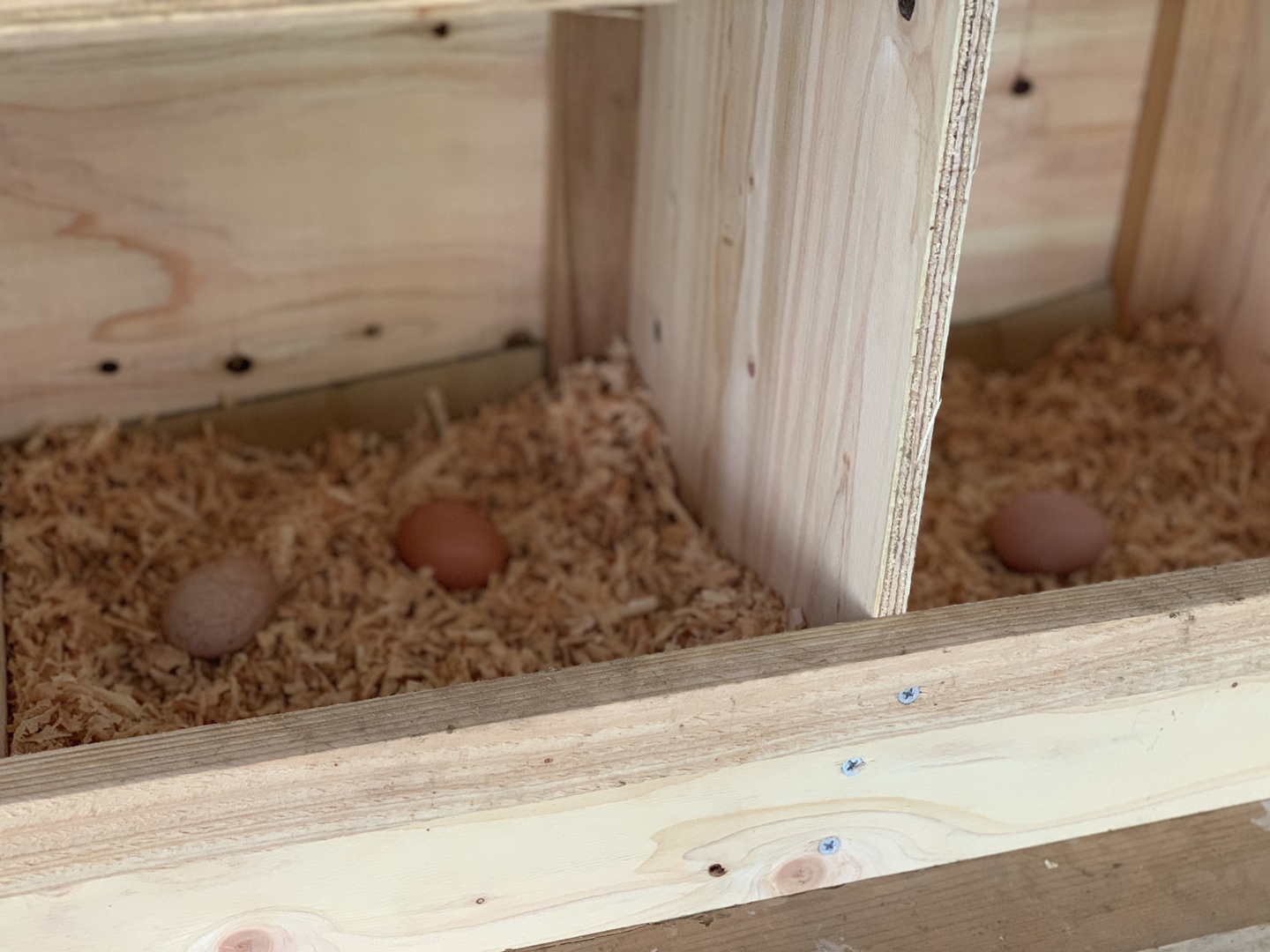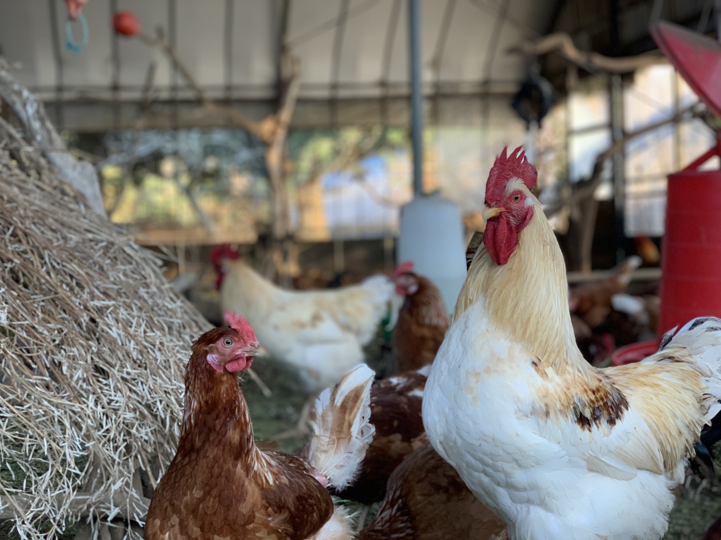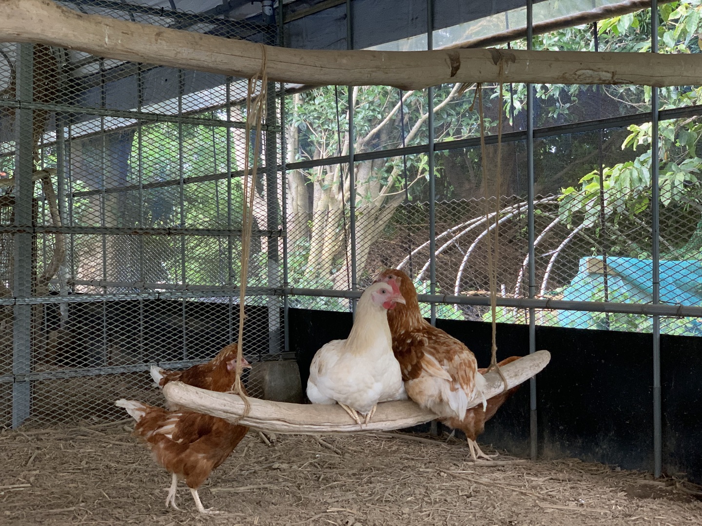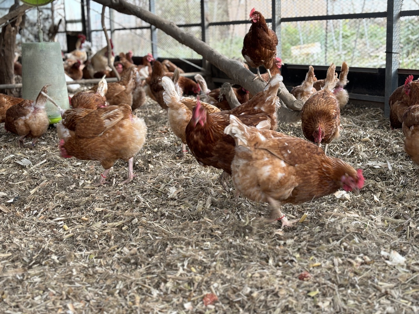 鶏達は止まり木で眠り、巣箱で卵を産み、自由に歩き回り砂浴びをし、とても元気です。