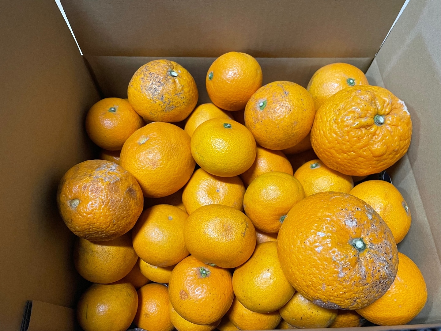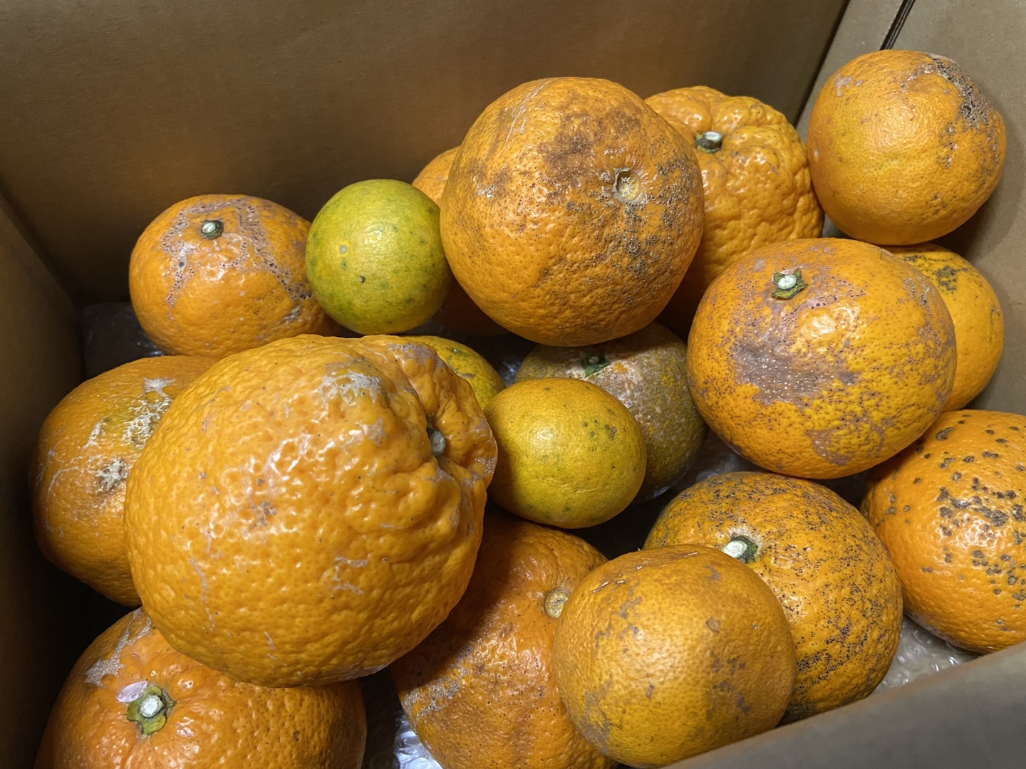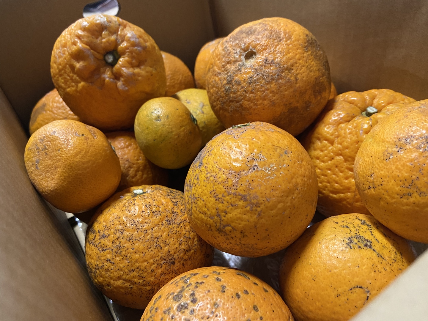 すぐに食べないと腐ってしまう「生キズ果」に「ヤケ果」・みかんの形をしていない(笑)「変形果」・まだまだ緑色が残っている「着色不良果」・触ったらブヨブヨしている「軟果」などの「超訳あり品」をご家族で召し上がる事おススメで販売します。とてもおすそ分け出来るもんじゃありません。