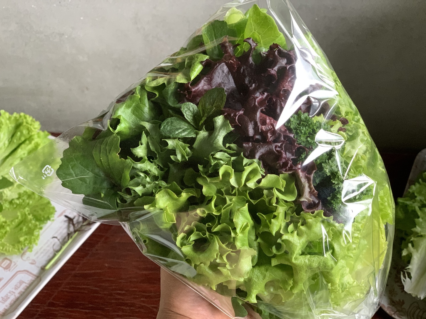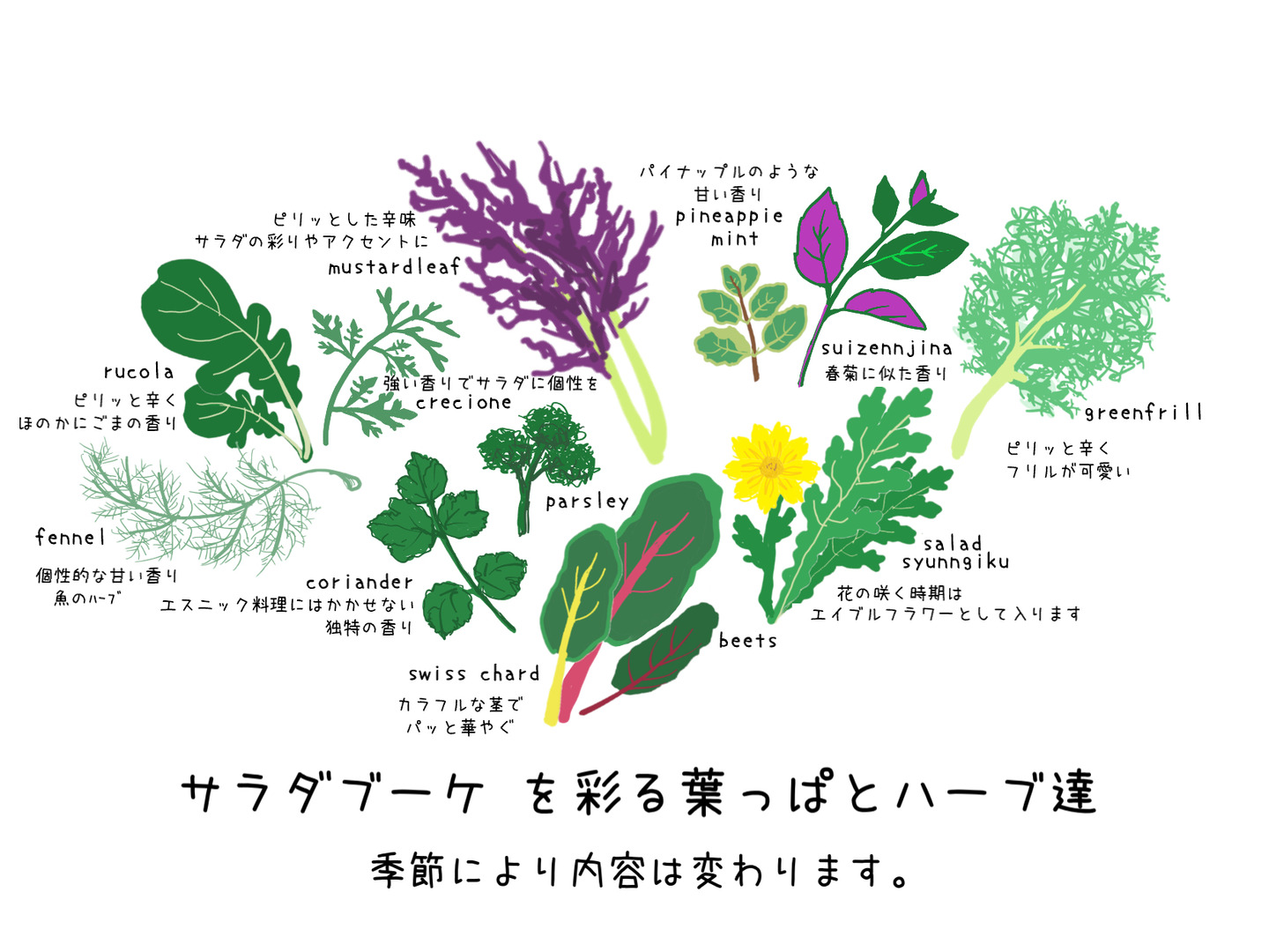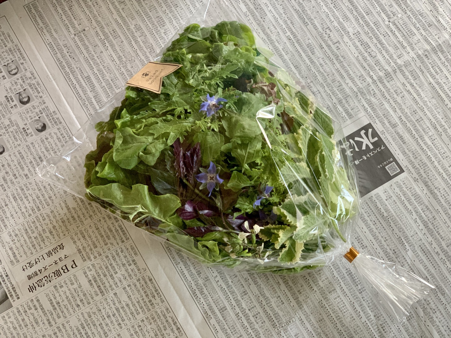 グリーンやパープルのフリルが可愛いリーフレタスに季節のハーブ『花束みたいね』とのお客様の声から名付けられました。ひと袋の中に数種類のリーフレタスやルッコラやマスタードリーフなどのハーブが入ったサラダセットになります。