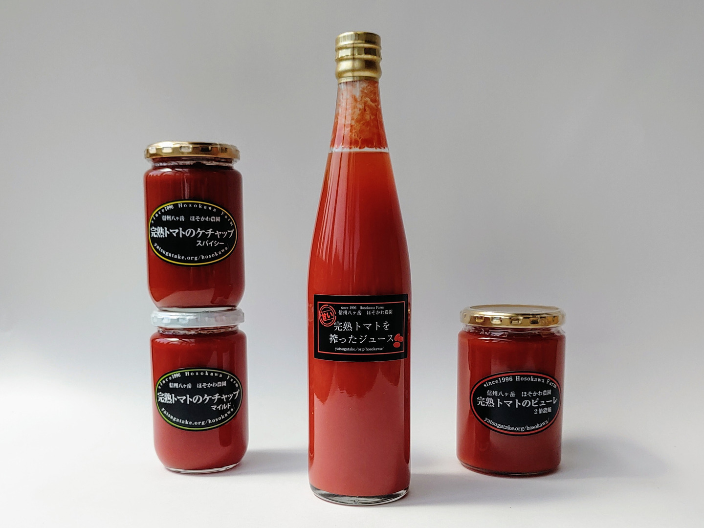 ほそかわ農園のトマト製品の詰め合わせ ・トマトジュース 500ml ・ケチャップマイルド 320g ・ケチャップスパイシー 320g ・トマトピューレ 350g 各1本